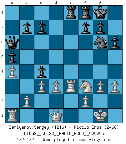 Last move : 1/2-1/2 2017 October 8 23:45:5 [Event "FICGS__CHESS__RAPID_GOLD__000005"] [Site "FICGS"] [Date "2017.08.24"] [Round "2"] [White "Zemlyanov,Sergey"] [Black "Riccio,Eros"] [Result "1/2-1/2"] [WhiteElo "1216"] [BlackElo "2460"] 1.e4 e5 2.Nf3 Nc6 3.Bc4 Bc5 4.O-O Nf6 5.d3 d6 6.c3 a5 7.Nbd2 O-O 8.h3 Be6 9.Bb5 h6 10.Re1 Qb8 11.Nf1 Qa7 12.Be3 Bxe3 13.Nxe3 Ne7 14.a4 Ng6 15.Bc4 Bxc4 16.Nxc4 Qa6 17.g3 Nxe4 18.Rxe4 d5 19.Rxe5 dxc4 20.Re3 Rae8 1/2-1/2 Giuoco Piano Kingside Castling by player White (move 4) Kingside Castling by player Black (move 7) This chess game ended in a draw. Follow this game move after move (download)All I want to do, ever, is just play Chess. (Bobby Fischer) Viele Opfer benötigen überhaupt keine konkrete Berechnung. Es genügt sich die entstehende Position kurz vorzustellen, um uns davon zu überzeugen, dass das Opfer korrekt ist. (Mikhail Nekhemyevich Tal) Las Aperturas te enseñan aperturas. ¡Los Finales te enseñan Ajedrez!. (Stephan Gerzadowicz) Pour moi, les échecs ne sont pas un jeu mais un art. (Alexandre Alekhine) Difficult things take a long time, impossible things a little longer. (Author unknown)