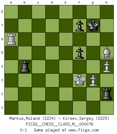 Last move : 0-1 2017 October 18 14:39:12 [Event "FICGS__CHESS__CLASS_M__000078"] [Site "FICGS"] [Date "2017.08.25"] [Round "1"] [White "Markus,Roland"] [Black "Kireev,Sergey"] [Result "0-1"] [WhiteElo "2224"] [BlackElo "2225"] 1.d4 d5 2.Bf4 Nf6 3.e3 c5 4.c3 Nc6 5.Nd2 Bf5 6.Qb3 Qc8 7.Ngf3 c4 8.Qd1 h6 9.b3 b5 10.Ne5 Nxe5 11.Bxe5 e6 12.Bxf6 gxf6 13.e4 dxe4 14.bxc4 bxc4 15.Nxc4 Be7 16.Be2 Kf8 17.O-O Kg7 18.Qd2 h5 19.Qe3 Qc6 20.Rfb1 Bg6 21.h4 Rac8 22.Qd2 e3 23.Qxe3 Qd5 24.Nd2 Bxb1 25.c4 Qf5 26.Rxb1 Bd6 27.g3 e5 28.Qe4 Qxe4 29.Nxe4 Bb8 30.d5 f5 31.Nd2 Bd6 32.Nb3 e4 33.Kf1 Kf6 34.Rc1 Bc5 35.Rc3 Rc7 36.Nxc5 Rxc5 37.Ra3 a5 38.Rb3 R5c8 39.Ke1 Rb8 40.Rc3 Ke5 41.Kd2 Rb2+ 42.Ke3 Rxa2 43.c5 Rb2 44.d6 a4 45.Bc4 Ra8 46.d7 a3 47.c6 Kd6 48.c7 Kxd7 49.Bd5 Rc8 50.Rxa3 Rxc7 51.f3 exf3 52.Bxf3 Ke6 53.Bxh5 Kf6 54.Kf4 Rb4+ 55.Kf3 Rc2 56.Ke3 Rg2 57.Kf3 Rh2 58.Ra6+ Kg7 0-1 Queen's pawn, Mason variation Kingside Castling by player White (move 17) 10 pieces endgame at move 53 : White KRBPP , Black KRRPP WHITE : King + 1 Rook 1 Bishop 2 Pawns BLACK : King + 2 Rooks 2 Pawns Player Black won this chess game. Follow this game move after move (download)Chess makes man wiser and clear-sighted. (Vladimir Putin) Um dein Spiel zu verbessern musst du zuallererst das Endspiel studieren, denn diese kann unabhängig studiert werden. Die Eröffnung und das Mittelspiel müssen immer in Bezug gesetzt werden zum Endspiel. (José Raúl Capablanca) No todos los artistas son jugadores de Ajedrez, pero todos los jugadores de Ajedrez son artistas. (Marcel Duchamp) Si rien de grave n'est détecté lors de l'analyse d'une position, on joue alors le coup. Seconde règle de Blumenfeld. Unless I accept my faults I will most certainly doubt my virtues. (Hugh Prather)