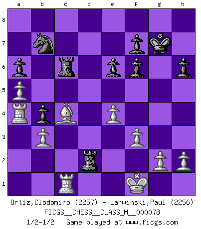 Last move : 1/2-1/2 2017 September 7 20:53:26 [Event "FICGS__CHESS__CLASS_M__000078"] [Site "FICGS"] [Date "2017.08.25"] [Round "1"] [White "Ortiz,Clodomiro"] [Black "Larwinski,Paul"] [Result "1/2-1/2"] [WhiteElo "2257"] [BlackElo "2256"] 1.Nf3 Nf6 2.d4 d5 3.c4 dxc4 4.e3 e6 5.Bxc4 c5 6.O-O a6 7.b3 b5 8.Be2 Nbd7 9.Bb2 Bb7 10.Nbd2 Be7 11.a4 b4 12.Rc1 Rc8 13.Nc4 O-O 14.Nfe5 cxd4 15.Nxd7 Nxd7 16.Bxd4 h6 17.a5 Bf6 18.f3 Bd5 19.Bxf6 Qxf6 20.Qd4 Rfd8 21.Qxf6 gxf6 22.e4 Bxc4 23.Bxc4 Nc5 24.Rc2 Nb7 25.Ra2 Rc6 26.Ra4 Rd4 27.Rc1 Kg7 28.Kf1 Rd2 1/2-1/2 Reti Opening Kingside Castling by player White (move 6) Kingside Castling by player Black (move 13) This chess game ended in a draw. Follow this game move after move (download)After a bad opening, there is hope for the middle game. After a bad middle game, there is hope for the endgame. But once you are in the endgame, the moment of truth has arrived. (Edmar Mednis) Schach ist Kampf, hauptsächlich jedoch gegen die eigenen Fehler. (Savielly Grigorievitsch Tartakower) Todos los jugadores de Ajedrez deberían tener un pasatiempo. (Savielly Tartakower) Mais n'est-ce pas déjà le limiter injurieusement que d'appeler les échecs un jeu? N'est-ce pas aussi une science, un art, ou quelque chose qui, comme le cercueil de Mahomet entre ciel et terre, est suspendu entre l'un et l'autre, et qui réunit un nombre incroyable de contraires ? (Stefan Zweig) The leaves of memory seemed to make a mournful rustling in the dark. (Henry Wadsworth Longfellow)