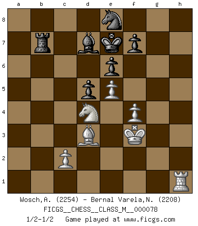 Last move : 1/2-1/2 2018 February 21 21:49:50 [Event "FICGS__CHESS__CLASS_M__000078"] [Site "FICGS"] [Date "2017.08.25"] [Round "1"] [White "Wosch,Arkadiusz"] [Black "Bernal Varela,Nelson"] [Result "1/2-1/2"] [WhiteElo "2254"] [BlackElo "2208"] 1.e4 e6 2.d4 d5 3.Nc3 Nf6 4.Bg5 Be7 5.e5 Nfd7 6.Bxe7 Qxe7 7.f4 O-O 8.Nf3 c5 9.Qd2 a6 10.dxc5 Nxc5 11.Bd3 Nc6 12.O-O b5 13.Qe3 Qa7 14.Ne2 Na4 15.Qxa7 Rxa7 16.Rab1 Bd7 17.Ned4 Ne7 18.Kf2 b4 19.b3 Nc5 20.Ra1 Rb8 21.g4 a5 22.a3 g6 23.axb4 Rxb4 24.Ke3 a4 25.h4 Kf8 26.Rg1 h6 27.h5 gxh5 28.gxh5 Ra8 29.Ra3 Rc8 30.bxa4 Bxa4 31.Nh4 Bd7 32.Rga1 Be8 33.Nhf3 Bc6 34.Ra5 Ne4 35.Nh4 Bd7 36.Ra8 Nc5 37.Nhf3 Ba4 38.Ra7 Be8 39.Ra8 Ba4 40.Ra7 Be8 41.R1a5 Nb7 42.R5a6 Nc5 43.Ra3 Ne4 44.Ra8 Ng3 45.Ra1 Bd7 46.Rxc8+ Bxc8 47.Ra8 Kg7 48.Ra7 Rb7 49.Ra1 Kf8 50.Nd2 Bd7 51.Ra8+ Kg7 52.Ra1 Kf8 53.Kf3 Nxh5 54.N2b3 Nc6 55.Nxc6 Bxc6 56.Nd4 Bd7 57.Rh1 Ng7 58.Rxh6 Ne8 59.Rh8+ Ke7 60.Rh1 1/2-1/2 French : Classical, Steinitz variation Kingside Castling by player Black (move 7) Kingside Castling by player White (move 12) This chess game ended in a draw. Follow this game move after move (download)I don't believe in psychology. I believe in good moves. (Bobby Fischer) Stil? Ich habe keinen Stil! (Anatoly Karpov) En la vida, como en el Ajedrez, los Peones propios obstruyen nuestro camino. La gran fortuna de un hombre, su comodidad, placer, hijos, libros, que deberían ayudarle a ganar, con mucha frecuencia lo ponen en Jaque Mate. (Charles Buxton) La tactique est l'élément le plus important du milieu de jeu. (Siegbert Tarrasch) What doesn't kill us makes us stronger. (Friedrich Nietzsche)