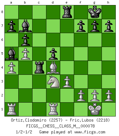 Last move : 1/2-1/2 2017 September 15 13:51:10 [Event "FICGS__CHESS__CLASS_M__000078"] [Site "FICGS"] [Date "2017.08.25"] [Round "1"] [White "Ortiz,Clodomiro"] [Black "Fric,Lubos"] [Result "1/2-1/2"] [WhiteElo "2257"] [BlackElo "2218"] 1.d4 Nf6 2.c4 e6 3.Nc3 Bb4 4.e3 O-O 5.Bd3 d5 6.Nf3 c5 7.cxd5 exd5 8.dxc5 Nbd7 9.O-O Nxc5 10.Ne2 Nxd3 11.Qxd3 b6 12.a3 Bd6 13.b4 Re8 14.Bb2 Bb7 15.Rfd1 Ne4 16.Nc3 Nxc3 17.Bxc3 Rc8 18.b5 Qc7 19.Bd4 Qc2 20.a4 Qxd3 21.Rxd3 Rc2 22.R3d1 Bb4 23.Ne1 Rc4 24.Nf3 Rc7 25.Ne5 Ba5 26.Nd3 Rc4 1/2-1/2 Nimzo-Indian : 4.e3 O-O, 5.Bd3 d5 Kingside Castling by player Black (move 4) Kingside Castling by player White (move 9) This chess game ended in a draw. Follow this game move after move (download)First-class players lose to second class players because second-class players sometimes play a first-class game. (Tarrasch) Ivan Sokolov treibt mich als Beifahrer an mit go Loeky go - . (Loek van Wely) Los problemas de Ajedrez exigen del compositor las mismas virtudes que caracterizan todo el arte de valor: originalidad, invención, concisión, armonía, complejidad e insinceridad explendida. (Vladimir Nabokov) C'est la seule position que je connaisse où les deux camps sont mals. Propos prêtés à V. Anand. 98% of all statistics are made up. (Author unknown)