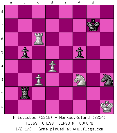 Last move : 1/2-1/2 2017 December 14 13:5:25 [Event "FICGS__CHESS__CLASS_M__000078"] [Site "FICGS"] [Date "2017.08.25"] [Round "1"] [White "Fric,Lubos"] [Black "Markus,Roland"] [Result "1/2-1/2"] [WhiteElo "2218"] [BlackElo "2224"] 1.e4 e5 2.Nf3 Nc6 3.Bb5 a6 4.Ba4 Nf6 5.O-O Be7 6.Re1 b5 7.Bb3 O-O 8.c3 d5 9.exd5 Nxd5 10.Nxe5 Nxe5 11.Rxe5 c6 12.d4 Bd6 13.Re1 Qh4 14.g3 Qh3 15.Be3 Bg4 16.Qd3 Rae8 17.Nd2 Re6 18.a4 Qh5 19.axb5 axb5 20.Nf1 Bf5 21.Qd2 Bh3 22.Bd1 Qg6 23.Bf3 Qf5 24.Qe2 Rfe8 25.Bg2 Bxg2 26.Kxg2 Rf6 27.Qd2 Rf8 28.Kg1 Rg6 29.Qc1 Qh3 30.Ra6 Qc8 31.Ra1 f5 32.f4 h5 33.Kh1 h4 34.Qd1 Rh6 35.Kg1 hxg3 36.hxg3 g5 37.Qf3 gxf4 38.Bxf4 Bxf4 39.gxf4 Qc7 40.Re2 Nxf4 41.Rh2 Rxh2 42.Nxh2 Re8 43.Qg3+ Qg7 44.Qxg7+ Kxg7 45.Ra6 Re2 46.Nf3 Nh3+ 47.Kh1 Rxb2 48.Rxc6 1/2-1/2 Ruy Lopez : Closed, 7...O-O Kingside Castling by player White (move 5) Kingside Castling by player Black (move 7) 10 pieces endgame at move 48 : White KRNPP , Black KRNPP WHITE : King + 1 Rook 1 Knight 2 Pawns BLACK : King + 1 Rook 1 Knight 2 Pawns This chess game ended in a draw. Follow this game move after move (download)Half the variations which are calculated in a tournament game turn out to be completely superfluous. Unfortunately, no one knows in advance which half. (Jan Tinman) Eine Person mit durchschnittlichem IQ kann etwa eine ELO von 2000 erreichen. (Jonathan Levitt) Ayuda a tus piezas para que ellas te puedan ayudar. (Paul Morphy) Pour moi, les échecs ne sont pas un jeu mais un art. (Alexandre Alekhine) A woman without a man is like a fish without a bicycle. (Gloria Steinem)