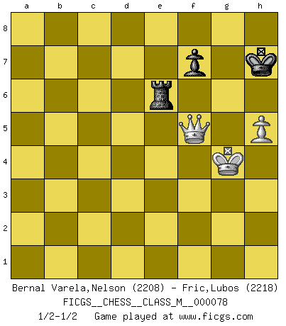Last move : 1/2-1/2 2018 May 9 13:24:54 [Event "FICGS__CHESS__CLASS_M__000078"] [Site "FICGS"] [Date "2017.08.25"] [Round "1"] [White "Bernal Varela,Nelson"] [Black "Fric,Lubos"] [Result "1/2-1/2"] [WhiteElo "2208"] [BlackElo "2218"] 1.e4 e5 2.Nf3 Nc6 3.Bb5 Nf6 4.d3 Bc5 5.Bxc6 dxc6 6.O-O Nd7 7.Re1 O-O 8.c3 Re8 9.d4 Bb6 10.h3 h6 11.a4 a5 12.Nbd2 exd4 13.cxd4 Nf6 14.Ra3 Be6 15.Nf1 Nh5 16.Rc3 Qe7 17.b3 Rad8 18.Rd3 Bc8 19.g4 Nf6 20.Ng3 Nh7 21.Kg2 Nf8 22.Nf5 Bxf5 23.gxf5 Nh7 24.Bb2 Qd7 25.R1e3 Nf6 26.Ne5 Qe7 27.Re1 Qf8 28.f4 Kh7 29.Qf3 Qe7 30.Re2 Ba7 31.Nc4 Rg8 32.Nxa5 g5 33.fxg6+ Rxg6+ 34.Kh2 Rdg8 35.e5 Rg3 36.exf6 Rxf3 37.fxe7 Rxd3 38.Nxb7 Re8 39.Na5 Bxd4 40.Bxd4 Rxd4 41.Nxc6 Rxf4 42.a5 Rf6 43.Rc2 Rxc6 44.Rxc6 Rxe7 45.a6 Re2+ 46.Kg1 Ra2 47.h4 Kg7 48.Kf1 h5 49.b4 Ra4 50.b5 Ra5 51.Rc5 c6 52.bxc6 Rxc5 53.a7 Rxc6 54.a8Q Rf6+ 55.Ke2 Re6+ 56.Kf3 Rf6+ 57.Ke4 Re6+ 58.Kf5 Rg6 59.Qa1+ Kg8 60.Qc3 Kh7 61.Ke5 Re6+ 62.Kf5 Rg6 63.Qe5 Re6 64.Qg3 Rg6 65.Qe5 Re6 66.Qd5 Kg7 67.Qd4+ Kh7 68.Qd8 Kg7 69.Qg5+ Rg6 70.Qxh5 Rf6+ 71.Kg4 Ra6 72.Qe5+ Kg8 73.h5 Re6 74.Qf4 Kg7 75.Qg5+ Kh7 76.Qf5+ 1/2-1/2 Ruy Lopez : Berlin defense Kingside Castling by player White (move 6) Kingside Castling by player Black (move 7) 10 pieces endgame at move 44 : White KRPPP , Black KRPPP WHITE : King + 1 Rook 3 Pawns BLACK : King + 1 Rook 3 Pawns 9 pieces endgame at move 52 : White KRPPP , Black KRPP WHITE : King + 1 Rook 3 Pawns BLACK : King + 1 Rook 2 Pawns 8 pieces endgame at move 52 : White KPPP , Black KRPP WHITE : King + 3 Pawns BLACK : King + 1 Rook 2 Pawns 7 pieces endgame at move 53 : White KPP , Black KRPP WHITE : King + 2 Pawns BLACK : King + 1 Rook 2 Pawns Promotion Queen by player White (move 54) 6 pieces endgame at move 70 : White KQP , Black KRP WHITE : King + 1 Queen 1 Pawn BLACK : King + 1 Rook 1 Pawn This chess game ended in a draw. Follow this game move after move (download)I don't believe in psychology. I believe in good moves. (Bobby Fischer) Ein Kibitz ist einer, der deinem Gegner gute Ratschläge gibt. (Andrew Soltis) Nunca nadie ha ganado una partida de Ajedrez rindiendose. (Unknown) Ce qui caractérise les parties de combat, c'est que si le défenseur a constamment de difficiles problèmes à résoudre, l'attaquant doit chercher sans relâche de nouvelles possibilités d'attaque. (Koblentz) Man with more than one clock never knows what time it is. (Chinese thought)