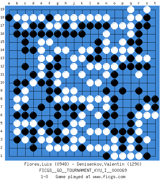 Last move : 1-0 2017 December 11 23:44:34 [Event "FICGS__GO__TOURNAMENT_KYU_I__000069"] [Site "FICGS"] [Date "2017.08.30"] [Round "1"] [Black "Flores,Luis"] [White "Denisenkov,Valentin"] [Result "1-0"] [Rating 1 "0948"] [Rating 2 "1290"] 1.d4 q16 2.d16 q3 3.c10 f17 4.l17 j17 5.p9 o17 6.q6 r5 7.g16 g17 8.c15 d18 9.g9 f3 10.d2 j3 11.h3 h2 12.g3 g2 13.f4 f2 14.j4 k3 15.k4 l4 16.l3 l2 17.m3 m4 18.k2 j2 19.h17 h18 20.h16 j18 21.f16 c17 22.p16 p17 23.j16 q14 24.e17 e18 25.f18 g18 26.n3 n4 27.o4 o3 28.p3 o2 29.k16 r11 30.r9 s7 31.q4 r4 32.r3 q2 33.p2 p1 34.p4 n2 35.q1 r1 36.r2 q1 37.s1 o1 38.q15 p15 39.n1 m2 40.n9 j12 41.r15 p14 42.r16 q17 43.r17 r18 44.s18 q18 45.r7 s6 46.s8 s3 47.k12 k13 48.l13 j13 49.o16 n16 50.o15 n14 51.m15 n15 52.r14 r13 53.g6 c3 54.d3 b5 55.q13 l14 56.m14 l12 57.m13 k11 58.r12 p13 59.q12 k14 60.c4 b4 61.l11 e12 62.g12 g11 63.f11 h11 64.f10 l10 65.m11 j9 66.b3 b8 67.c7 b7 68.c12 h9 69.b9 c8 70.h7 l8 71.c6 c9 72.b10 d10 73.d11 c5 74.b6 d5 75.e7 e4 76.e5 e3 77.f5 e11 78.f12 e13 79.e10 e15 80.e16 g14 81.f14 f13 82.g13 h14 83.c14 f15 84.c16 l18 85.p12 n12 86.o13 o14 87.d6 m12 88.b17 b18 89.o6 n7 90.m17 m18 91.j6 o12 92.o11 n11 93.o10 m10 94.o7 k6 95.k7 h4 96.g4 k5 97.n6 j5 98.b16 l7 99.h5 j4 100.m7 m6 101.t7 t6 102.t8 n8 103.o8 m8 104.k17 k18 105.d17 c18 106.n17 n18 107.n5 k8 108.a18 s19 109.s17 j8 110.j7 g8 111.g7 h8 112.f8 g10 113.f9 r6 114.d14 e14 115.r19 q19 116.q5 s13 117.s12 1-0 Here are the names of the openings (joseki) played in the four corners : Corner d16 : d16 f17 Hoshi (Hwajeom, Seongjeom, Xingwei`) 4-4 Point. The star or hoshi (4-4) point, emphasizing influence at the potential expense of territory. Ikken Kakari (Hankan Keolch'im, Yi Gua`jiao~, 1-Space Low Approach). White 2 is the standard approach move to the 4-4. Corner q16 : q16 l17 Hoshi (Hwajeom, Seongjeom, Xingwei`) 4-4 Point. The star or hoshi (4-4) point, emphasizing influence at the potential expense of territory. Corner q4 : q3 p9 Komoku (Somok, Xiao~mu`) 3-4 Point. The komoku (3-4) point is the traditional corner enclosure move.. Player Black won this Go (weiqi, baduk) game. Follow this game move after move (download)One point in the center is worth ten in the corner. (Anonymous) If you work for a living, why do you kill yourself working ? (Tuco to a chicken in The Good, The Bad and The Ugly)