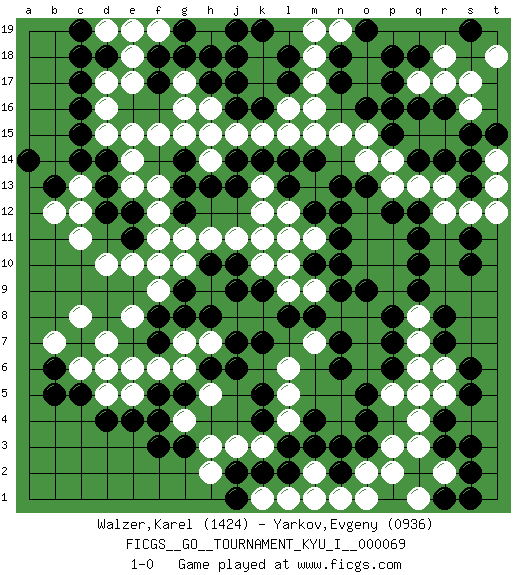 Last move : 1-0 2018 April 2 8:24:8 [Event "FICGS__GO__TOURNAMENT_KYU_I__000069"] [Site "FICGS"] [Date "2017.08.30"] [Round "1"] [Black "Walzer,Karel"] [White "Yarkov,Evgeny"] [Result "1-0"] [Rating 1 "1424"] [Rating 2 "0936"] 1.d4 d16 2.q16 q4 3.o3 p3 4.o4 d10 5.k16 k10 6.k4 d5 7.e4 e5 8.q10 j15 9.f17 p5 10.r7 q7 11.r8 q8 12.q9 p9 13.d14 e15 14.c17 d17 15.c16 d15 16.c15 c13 17.c14 e14 18.d13 c12 19.h17 h16 20.j16 h15 21.r3 q3 22.r4 r5 23.s5 r6 24.s6 e13 25.d12 c11 26.e12 f12 27.c7 d7 28.c5 p10 29.q11 p11 30.p12 o12 31.o13 p13 32.q12 o14 33.n13 p14 34.n17 n15 35.n12 o11 36.l14 l15 37.m10 m9 38.n9 n10 39.n11 o10 40.p8 o8 41.o9 n8 42.p7 q6 43.p6 q5 44.o5 f10 45.d18 c6 46.b6 d6 47.b5 b7 48.g3 g4 49.m8 l9 50.l8 c8 51.k9 l10 52.l11 j11 53.j10 k11 54.j9 h11 55.g9 g10 56.g8 h3 57.f3 e18 58.c19 l16 59.k14 k15 60.l17 m17 61.l18 m18 62.j17 r2 63.s3 r17 64.r16 q17 65.p16 o2 66.n2 p2 67.s2 m2 68.n3 n1 69.k2 k3 70.l3 j3 71.l2 l4 72.m4 l5 73.k5 l6 74.j6 h5 75.h6 r13 76.p17 s16 77.s15 s17 78.r14 q13 79.s13 r12 80.n18 m19 81.q18 r18 82.p18 e17 83.f18 f19 84.g19 e19 85.h18 k18 86.j19 k17 87.j18 g17 88.k19 s12 89.q14 t13 90.s14 t18 91.s19 g16 92.g18 d19 93.c18 f11 94.b13 b12 95.a14 m16 96.o16 o15 97.f5 f6 98.g5 g6 99.f4 g7 100.j7 h7 101.h8 l12 102.m14 m15 103.j13 m11 104.n10 f15 105.s10 t14 106.p15 t12 107.t15 m7 108.k7 f9 109.f8 e8 110.f7 e6 111.h10 o6 112.n6 o7 113.n7 n19 114.o19 f13 115.h13 k13 116.j14 h14 117.g12 g11 118.g13 g15 119.l13 k12 120.m12 l11 121.e11 e10 122.s11 m1 123.m3 l1 124.g14 k1 125.j2 h2 126.j1 o1 127.r1 q1 128.s1 1-0 Here are the names of the openings (joseki) played in the four corners : Corner q4 : q4 o3 Hoshi (Hwajeom, Seongjeom, Xingwei`) 4-4 Point. The star or hoshi (4-4) point, emphasizing influence at the potential expense of territory. Ikken Kakari (Hankan Keolch'im, Yi Gua`jiao~, 1-Space Low Approach). Black 2 is the standard approach move to the 4-4. Corner d4 : d4 d5 Hoshi (Hwajeom, Seongjeom, Xingwei`) 4-4 Point. The star or hoshi (4-4) point, emphasizing influence at the potential expense of territory. Player Black won this Go (weiqi, baduk) game. Follow this game move after move (download)In opponents' sphere of influence, avoid sharp conflict, don't move too deep. (Otake Hideo, 9p) Optimism is a variety of information deficit. Sometimes especially true for correspondence chess games. (Michael Aigner)
