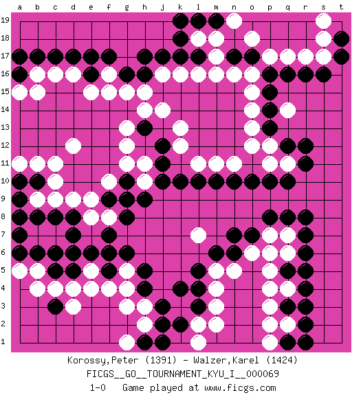 Last move : 1-0 2018 January 22 16:41:16 [Event "FICGS__GO__TOURNAMENT_KYU_I__000069"] [Site "FICGS"] [Date "2017.08.30"] [Round "1"] [Black "Korossy,Peter"] [White "Walzer,Karel"] [Result "1-0"] [Rating 1 "1391"] [Rating 2 "1424"] 1.q16 d4 2.q3 d16 3.r5 q4 4.r4 p4 5.r8 p3 6.r3 m4 7.f17 f16 8.g16 f15 9.c17 c16 10.d17 d12 11.k10 q14 12.r12 o14 13.o17 n16 14.n17 m16 15.n10 m17 16.k17 k16 17.j17 g15 18.h16 j14 19.g10 d9 20.k4 h3 21.l3 m3 22.h4 g4 23.h5 l2 24.k2 m2 25.j3 h2 26.j2 g3 27.c3 c4 28.f6 d3 29.d6 c7 30.c6 r17 31.r16 q17 32.s16 p17 33.p15 o15 34.p14 o12 35.p13 o13 36.q10 l7 37.m6 n5 38.n6 p6 39.o7 q7 40.q8 l11 41.l10 f8 42.g8 g12 43.l5 q2 44.r2 p2 45.r7 s17 46.p16 o16 47.t17 s18 48.t18 o18 49.f9 e8 50.j12 h11 51.j10 k12 52.j11 h10 53.h9 n11 54.o10 k13 55.h13 g13 56.b6 b5 57.a9 b7 58.a7 b11 59.b10 c11 60.d7 c9 61.d8 e9 62.c8 b9 63.b8 f10 64.g9 g11 65.b17 b16 66.e17 e5 67.f7 c10 68.a10 a11 69.a8 g5 70.g6 p7 71.p8 p12 72.q12 p11 73.p10 q11 74.r11 l18 75.k18 j16 76.a16 a15 77.a17 b15 78.l17 m18 79.k19 h15 80.r1 o6 81.l4 m5 82.n7 l16 83.h17 h14 84.m10 m11 85.q5 p5 86.e16 e15 87.c5 b4 88.l19 s19 89.m19 n19 90.f5 f4 91.h1 g1 92.j1 q6 93.r6 a5 94.q1 p1 95.d5 l1 96.e6 e4 97.a6 1-0 Here are the names of the openings (joseki) played in the four corners : Corner d16 : d16 f17 Hoshi (Hwajeom, Seongjeom, Xingwei`) 4-4 Point. The star or hoshi (4-4) point, emphasizing influence at the potential expense of territory. Ikken Kakari (Hankan Keolch'im, Yi Gua`jiao~, 1-Space Low Approach). Black 2 is the standard approach move to the 4-4. Corner q16 : q16 q14 Hoshi (Hwajeom, Seongjeom, Xingwei`) 4-4 Point. The star or hoshi (4-4) point, emphasizing influence at the potential expense of territory. Ikken Takagakari (Hankan Nop'dakeolch'im, Yi Gaojia, 1-Space High Approach). Black typically responds at 6-4 or 3-10. Black 4-10 is played when Black finds play on the right side advantageous. Black 4-8 or 3-8 may be played when Black has support at top. Player Black won this Go (weiqi, baduk) game. Follow this game move after move (download)To reduce an opponent's large prospective territory, strike at the shoulder. (Anonymous) Art is the triumph over chaos. (John Cheever)