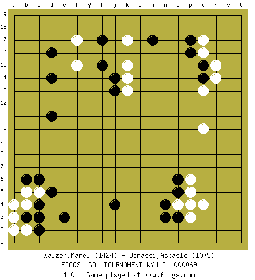 Last move : 1-0 2017 September 20 23:20:37 [Event "FICGS__GO__TOURNAMENT_KYU_I__000069"] [Site "FICGS"] [Date "2017.08.30"] [Round "1"] [Black "Walzer,Karel"] [White "Benassi,Aspasio"] [Result "1-0"] [Rating 1 "1424"] [Rating 2 "1075"] 1.c4 q4 2.e3 q16 3.d16 q10 4.o3 o4 5.n4 p3 6.o5 p4 7.n3 p5 8.o6 p6 9.j4 a3 10.b3 a4 11.b6 b4 12.c3 b5 13.c6 c5 14.d5 b2 15.c2 a2 16.d11 f17 17.h17 f15 18.d14 k17 19.h15 k15 20.j14 k14 21.j13 k13 22.q14 r14 23.q15 r15 24.p16 q17 25.p17 q13 26.m17 1-0 Here are the names of the openings (joseki) played in the four corners : Corner q4 : q4 o3 Hoshi (Hwajeom, Seongjeom, Xingwei`) 4-4 Point. The star or hoshi (4-4) point, emphasizing influence at the potential expense of territory. Ikken Kakari (Hankan Keolch'im, Yi Gua`jiao~, 1-Space Low Approach). Black 2 is the standard approach move to the 4-4. Corner q16 : q16 q14 Hoshi (Hwajeom, Seongjeom, Xingwei`) 4-4 Point. The star or hoshi (4-4) point, emphasizing influence at the potential expense of territory. Ikken Takagakari (Hankan Nop'dakeolch'im, Yi Gaojia, 1-Space High Approach). White typically responds at 6-4 or 3-10. White 4-10 is played when White finds play on the right side advantageous. White 4-8 or 3-8 may be played when White has support at top. Player Black won this Go (weiqi, baduk) game. Follow this game move after move (download)You don't have to be really good anymore to get good results. What's happening with chess is that it's gradually losing its place as the par excellence of intellectual activity. Smart people in search of a challenging board game might try a game called Go. (Hans Berliner, The New York Times, 2003) The various flowers seem good to different people. (Chinese proverb)