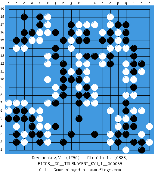 Last move : 0-1 2017 October 26 23:47:1 [Event "FICGS__GO__TOURNAMENT_KYU_I__000069"] [Site "FICGS"] [Date "2017.08.30"] [Round "1"] [Black "Denisenkov,Valentin"] [White "Cirulis,Ilmars"] [Result "0-1"] [Rating 1 "1290"] [Rating 2 "0825"] 1.d4 e15 2.d16 d15 3.c15 c14 4.c16 e16 5.e17 f17 6.e18 f18 7.c18 p5 8.q16 p15 9.q15 p16 10.p17 o17 11.q17 p14 12.r13 q12 13.r12 o18 14.q4 p4 15.p3 o3 16.q3 q5 17.r5 r6 18.r4 e5 19.d5 e4 20.e3 f3 21.d3 d6 22.c6 c7 23.c5 e6 24.k5 o2 25.p2 s6 26.j3 s3 27.r2 t4 28.s2 q11 29.r11 q10 30.m3 t2 31.s1 q1 32.q6 o6 33.q7 r8 34.k15 k13 35.j17 l17 36.h15 j14 37.g16 f16 38.g14 f13 39.g13 f12 40.h12 j15 41.j16 k16 42.h10 j11 43.h11 f10 44.h8 b7 45.b6 b14 46.b15 g9 47.h9 k9 48.k10 l10 49.k11 l11 50.l13 k12 51.j10 m7 52.r9 q8 53.l16 k17 54.l15 l12 55.m13 m17 56.n15 n16 57.o13 q14 58.r14 r10 59.o15 s11 60.s12 n12 61.o12 n13 62.o16 o14 63.l9 m9 64.l8 m8 65.k7 l7 66.k8 f2 67.g4 f4 68.h2 a6 69.a5 a7 70.e2 b4 71.b5 c2 72.b3 c3 73.b2 g8 74.g7 f7 0-1 Here are the names of the openings (joseki) played in the four corners : Corner d16 : e15 d16 Go-no-go (Wu~wu~) 5-5 Point. The 5-5 was experimented with briefly during the "New Fuseki" movement in Japan in the 1930s. The 5-5 point has not retained popularity because the 4-4 hoshi (star) point strikes a better balance between influence and territory. As one can see from the variations, though, the 5-5 is playable. Corner q16 : q16 p15 Hoshi (Hwajeom, Seongjeom, Xingwei`) 4-4 Point. The star or hoshi (4-4) point, emphasizing influence at the potential expense of territory. Corner q4 : p5 q4 Go-no-go (Wu~wu~) 5-5 Point. The 5-5 was experimented with briefly during the "New Fuseki" movement in Japan in the 1930s. The 5-5 point has not retained popularity because the 4-4 hoshi (star) point strikes a better balance between influence and territory. As one can see from the variations, though, the 5-5 is playable. Corner d4 : d4 e5 Hoshi (Hwajeom, Seongjeom, Xingwei`) 4-4 Point. The star or hoshi (4-4) point, emphasizing influence at the potential expense of territory. Player White won this Go (weiqi, baduk) game. Follow this game move after move (download)The rectangular six is normally alive. (Anonymous) Computers make it easier to do a lot of things, but most of the things they make it easier to do don't need to be done. (Andy Rooney)