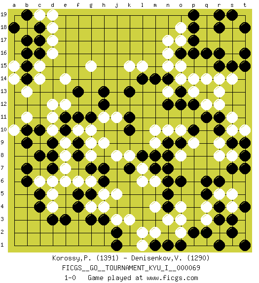 Last move : 1-0 2018 January 26 8:17:3 [Event "FICGS__GO__TOURNAMENT_KYU_I__000069"] [Site "FICGS"] [Date "2017.08.30"] [Round "1"] [Black "Korossy,Peter"] [White "Denisenkov,Valentin"] [Result "1-0"] [Rating 1 "1391"] [Rating 2 "1290"] 1.q16 d16 2.c4 q4 3.e3 d10 4.r10 o17 5.o16 n16 6.p17 o15 7.p16 n17 8.q13 o3 9.r6 r5 10.q6 k3 11.h3 j5 12.k10 n13 13.k13 k15 14.h13 g15 15.l14 l15 16.m14 n15 17.n14 o14 18.o13 p13 19.o12 p14 20.p12 q14 21.c8 e8 22.d9 e9 23.e10 d11 24.d8 e6 25.e11 e12 26.g11 d12 27.g5 g6 28.h6 h5 29.h7 h9 30.g7 f6 31.d7 e7 32.f5 g10 33.f11 k8 34.k7 l7 35.l8 j8 36.m7 l6 37.m8 m6 38.o6 r13 39.c17 d17 40.c16 c15 41.b15 c14 42.b14 b13 43.c18 d18 44.f13 e14 45.b10 b11 46.c10 q12 47.q11 r12 48.p10 r17 49.r16 s16 50.s15 s17 51.r15 q18 52.p18 o18 53.p19 q19 54.s19 r14 55.t16 t17 56.t15 s14 57.r18 c19 58.b19 d19 59.a18 a14 60.b16 a10 61.b9 d5 62.c5 d4 63.d3 c6 64.b6 d6 65.b7 g4 66.f4 h4 67.g3 g9 68.s3 s4 69.r3 q3 70.r4 s5 71.q5 r2 72.s2 s1 73.q2 t3 74.r1 t2 75.t1 b18 76.b17 s1 77.f9 f10 78.t1 q17 79.t4 s18 80.t18 t19 81.f8 g8 82.t18 a15 83.r19 h11 84.h12 j11 85.k11 r8 86.s7 s10 87.s9 s11 88.n5 m4 89.n4 n3 90.p2 o4 91.m1 m2 92.n1 l1 93.o1 l2 94.n6 o2 95.j2 j3 96.j1 s8 97.t8 r9 98.t9 t10 99.t7 o8 100.n7 p9 101.r11 o10 102.n12 m10 103.n9 n10 104.o9 m9 105.n8 1-0 Here are the names of the openings (joseki) played in the four corners : Corner q16 : q16 o17 Hoshi (Hwajeom, Seongjeom, Xingwei`) 4-4 Point. The star or hoshi (4-4) point, emphasizing influence at the potential expense of territory. Ikken Kakari (Hankan Keolch'im, Yi Gua`jiao~, 1-Space Low Approach). White 2 is the standard approach move to the 4-4. Corner d16 : d16 h13 Hoshi (Hwajeom, Seongjeom, Xingwei`) 4-4 Point. The star or hoshi (4-4) point, emphasizing influence at the potential expense of territory. Player Black won this Go (weiqi, baduk) game. Follow this game move after move (download)Knight's moves win running battles. (Anonymous) Depression is just anger without enthusiasm. (Unknown)