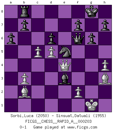 Last move : 0-1 2017 November 4 13:17:1 [Event "FICGS__CHESS__RAPID_A__000203"] [Site "FICGS"] [Date "2017.09.02"] [Round "1"] [White "Sorbi,Luca"] [Black "Sinsuat,Datuali"] [Result "0-1"] [WhiteElo "2050"] [BlackElo "1955"] 1.e4 c6 2.d4 d6 3.Nc3 Nd7 4.Nf3 e5 5.a4 Ngf6 6.Bc4 Be7 7.O-O Qc7 8.Re1 O-O 9.b3 Rd8 10.Bb2 exd4 11.Nxd4 a6 12.Nf5 Bf8 13.a5 Ne5 14.Ne3 Re8 15.Bf1 Neg4 16.Nxg4 Bxg4 17.Qd4 Rad8 18.h3 Be6 19.Bd3 Nd7 20.Nd5 cxd5 21.exd5 Bxh3 22.gxh3 Rxe1+ 23.Rxe1 Ne5 24.Re3 Qxa5 25.Bf5 Rb8 26.c4 Qd8 27.h4 Qf6 28.Qe4 g6 29.Bh3 Bh6 30.c5 Bxe3 0-1 Caro-Kann defense Kingside Castling by player White (move 7) Kingside Castling by player Black (move 8) Player Black won this chess game. Follow this game move after move (download)Excellence at Chess is one mark of a scheming mind. (Sir Arthur Conan Doyle) Der Partner hat auch seine Existenzberechtigung. (Savielly Grigorievitsch Tartakower) Los finales de Peón son del Ajedrez lo que el cesped es del Golf. (Cecil Purdy) La vie est comme un jeu d'échecs : nous esquissons un plan, mais celui-ci est tributaire de ce que daignent faire l'adversaire aux échecs et le destin dans la vie. (Arthur Schopenhauer) Do you know these so called Volunteers don't even get paid! (Simpsons)