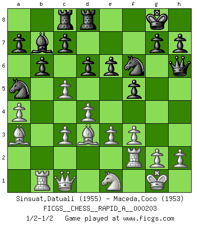 Last move : 1/2-1/2 2017 October 24 1:30:45 [Event "FICGS__CHESS__RAPID_A__000203"] [Site "FICGS"] [Date "2017.09.02"] [Round "1"] [White "Sinsuat,Datuali"] [Black "Maceda,Coco"] [Result "1/2-1/2"] [WhiteElo "1955"] [BlackElo "1953"] 1.d4 Nf6 2.c4 e6 3.Nf3 b6 4.Nc3 Bb4 5.a3 Bxc3+ 6.bxc3 Bb7 7.e3 O-O 8.Bd3 Ne4 9.a4 f5 10.Qc2 Qf6 11.O-O Nc6 12.Ba3 d6 13.Rab1 Qg6 14.Ne1 Qh6 15.f3 Na5 16.Qc1 Nf6 17.Bb4 Nc6 18.c5 Rac8 19.Ba3 Rfd8 20.Rf2 Na5 1/2-1/2 Queen's Indian : 4.Nc3 Kingside Castling by player Black (move 7) Kingside Castling by player White (move 11) This chess game ended in a draw. Follow this game move after move (download)There just isn't enough televised Chess. (David Letterman) Kein Großmeister ist normal. Sie unterscheiden sich nur im Ausmaß Ihrer Verrücktheit. (Viktor Kortschnoi) Tu sabes que vas a perder. Aún cuando tenía la ventaja, yo sabía que iba a perder. - al estar jugando con Fischer (Andrew Soltis) Demandez au pauvre Cg1 ce qu'il en pense. Eduard Gufeld à propos de la variante Saemisch de l'Est-Indienne. Horse racing is animated roulette. (Roger Kahn)