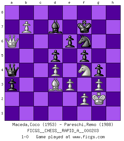 Last move : 1-0 2018 February 17 14:5:2 [Event "FICGS__CHESS__RAPID_A__000203"] [Site "FICGS"] [Date "2017.09.02"] [Round "1"] [White "Maceda,Coco"] [Black "Pareschi,Remo"] [Result "1-0"] [WhiteElo "1953"] [BlackElo "1988"] 1.d4 f5 2.c4 Nf6 3.Nf3 g6 4.Nc3 Bg7 5.g3 O-O 6.Bg2 e6 7.O-O d6 8.Re1 d5 9.Bf4 c6 10.e3 h6 11.Rc1 g5 12.Be5 Nbd7 13.Bd6 Rf7 14.Ne5 Nxe5 15.Bxe5 Ng4 16.Bxg7 Kxg7 17.Nb1 Nf6 18.Nd2 g4 19.Nb1 h5 20.Nc3 h4 21.Ne2 Kg8 22.Nf4 Rh7 23.cxd5 cxd5 24.Qb3 hxg3 25.hxg3 Ne8 26.Bf1 Qf6 27.Bg2 Qd8 28.Rc2 a5 29.Bf1 Bd7 30.Kg2 a4 31.Qa3 Nf6 32.Bd3 Kf7 33.R2c1 Qe7 34.b4 Rah8 35.Rh1 Nh5 36.Ne2 Qf8 37.Qc3 Nf6 38.b5 Rh6 39.Nf4 b6 40.Qc7 Rxh1 41.Rxh1 Rxh1 42.Kxh1 Qa3 43.Qxb6 Qxa2 44.Kg2 a3 45.Qa6 Qb3 46.b6 Qa4 47.b7 1-0 Dutch defense Kingside Castling by player Black (move 5) Kingside Castling by player White (move 7) Player White won this chess game. Follow this game move after move (download)Some sacrifices are sound; the rest are mine. (Mikhail Tal) Im Hotelzimmer gab es nur zwei Schaben. (Über die Turnierbedingungen) (Peter Swidler) La señal de un Gran Maestro es su habilidad de ganar una partida rápidamente y sin dolor. (Irving Chernev) Nous vivons dans un monde échiquéen : chaque jour qui passe est un défi à relever. (Philosophe Sasha) The difference between perseverance and obstinacy is that one comes from a strong will, and the other from a strong won't. (Henry Ward Beecher)