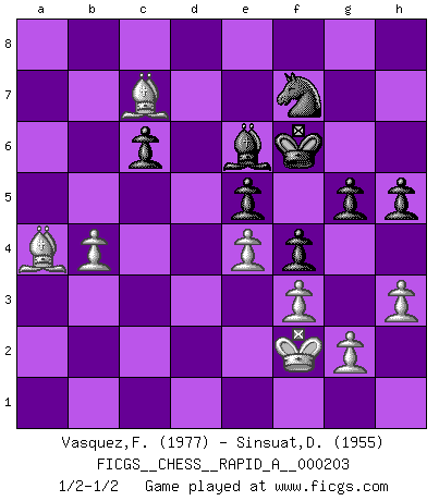 Last move : 1/2-1/2 2018 February 14 1:45:8 [Event "FICGS__CHESS__RAPID_A__000203"] [Site "FICGS"] [Date "2017.09.02"] [Round "1"] [White "Vasquez,Fernando"] [Black "Sinsuat,Datuali"] [Result "1/2-1/2"] [WhiteElo "1977"] [BlackElo "1955"] 1.e4 c6 2.d4 d6 3.Nc3 Nd7 4.Nf3 Qc7 5.Be2 e5 6.O-O Ngf6 7.Nh4 g6 8.Qd3 Bg7 9.Rd1 b5 10.a3 O-O 11.dxe5 dxe5 12.Be3 Re8 13.Qd2 a5 14.Nf3 Bb7 15.Ne1 Nf8 16.Nd3 Red8 17.f3 Ne6 18.Bf1 Qe7 19.Qf2 Nd7 20.Rd2 Bf8 21.Qe1 Bg7 22.b4 axb4 23.axb4 Rxa1 24.Qxa1 f5 25.Rd1 Ndf8 26.Qb2 h5 27.Ra1 Kh7 28.Ra7 Ra8 29.Rxa8 Bxa8 30.Nb1 Bb7 31.Nd2 Bc8 32.Qc3 f4 33.Bf2 Bd7 34.Nb3 g5 35.Be2 Be8 36.Qa1 Ng6 37.Qa6 Bf8 38.Ndc5 Nxc5 39.Nxc5 Qd6 40.Qc8 Qd2 41.Bf1 Bxc5 42.Bxc5 Qd7 43.Qxd7+ Bxd7 44.c4 Kg7 45.Kf2 Kf7 46.h3 bxc4 47.Bxc4+ Be6 48.Be2 Nh8 49.Bd1 Bd7 50.Bd6 Kf6 51.Bb3 Be6 52.Ba4 Nf7 53.Bc7 1/2-1/2 Caro-Kann defense Kingside Castling by player White (move 6) Kingside Castling by player Black (move 10) This chess game ended in a draw. Follow this game move after move (download)Many Chess players were surprised when after the game, Fischer quietly explained: 'I had already analyzed this possibility' in a position which I thought was not possible to foresee from the opening. (Mikhail Tal) Es hat in meinem Leben Zeiten gegeben, in denen das Schachspiel, wenn nicht zum Lebenszweck, so doch zu einem regelrechten Lebensersatz geworden ist. Man fühlt sich in solchen Zeiten nicht so, als besäße man eine göttliche Gabe, sondern eher so, als sei man von ihr besessen. (Garry Kasparov) La estratégia requiere pensar, la táctica requiere observación. (Max Euwe) Le profane ne songe pas à la somme de jouissance dont il se prive, qui méconnaît ce jeu aux ressources aussi variées que passionnantes. (Jean-Marie Jeanton-Lamarche) A belief is an idea the mind possesses, an idea that possesses the mind. (Robert Oxden Bolton)