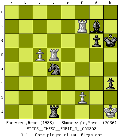 Last move : 0-1 2018 February 10 1:46:47 [Event "FICGS__CHESS__RAPID_A__000203"] [Site "FICGS"] [Date "2017.09.02"] [Round "1"] [White "Pareschi,Remo"] [Black "Skwarczylo,Marek"] [Result "0-1"] [WhiteElo "1988"] [BlackElo "2036"] 1.d4 d5 2.Bf4 Bf5 3.Nf3 e6 4.e3 Nf6 5.Bg3 Be7 6.c4 c6 7.Nc3 O-O 8.c5 Nbd7 9.b4 b6 10.a3 Nh5 11.Ne5 Nxe5 12.Bxe5 Nf6 13.Bg3 a5 14.Be2 axb4 15.axb4 bxc5 16.bxc5 Nd7 17.O-O e5 18.Qd2 Re8 19.Bd3 Bxd3 20.Qxd3 Bf6 21.Rfc1 h5 22.h3 h4 23.Bh2 exd4 24.exd4 Nf8 25.Bd6 Ne6 26.Ne2 g6 27.Rcb1 Ng7 28.Bf4 Nf5 29.Bd2 Rc8 30.Bc3 Re4 31.Rb7 Qe8 32.Rb2 Rc7 33.Ra4 Rce7 34.Kf1 Kh7 35.Rab4 Qc8 36.Qd1 Bg7 37.Rd2 Bh6 38.Rdb2 Qe6 39.Ng1 Re3 40.R4b3 Qe4 41.Nf3 Rd3 42.Qe2 Ra7 43.Qe1 Rxf3 44.Qxe4 Rxc3 45.Qg4 Rc1+ 46.Ke2 Re7+ 47.Kd3 R7e1 48.Rb7 Red1+ 49.Qxd1 Rxd1+ 50.Ke2 Rg1 51.Rxf7 Bg7 52.Rb4 Kh6 53.Rb6 Rxg2 54.Rxc6 Nxd4+ 55.Kf1 Rh2 56.Rd6 Rxh3 57.Rxd5 Rd3 58.Kg2 h3+ 59.Kh1 Rd1+ 0-1 This chess game has been lost on time (started : 2017.09.02 12:23:41) Queen's pawn, Mason variation Kingside Castling by player Black (move 7) Kingside Castling by player White (move 17) Player Black won this chess game. Follow this game move after move (download)The laws of Chess do not permit a free choice: you have to move whether you like it or not. (Emanuel Lasker) Schach ist Krieg, im Schach geht es um testosterongesteuerte Urschreie. (Garry Kasparov) Del Ajedrez se ha dicho que la vida no es lo suficientemente larga para él, pero eso es culpa de la vida, no del Ajedrez. (William Ewart Napier) Les sacrifices démontrent seulement que quelqu'un a gaffé. (Savielly Tartacover) Rules and bones are meant to be broken. (Anonymous)