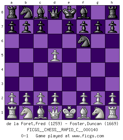 Last move : 0-1 2017 October 18 11:27:0 [Event "FICGS__CHESS__RAPID_C__000140"] [Site "FICGS"] [Date "2017.09.02"] [Round "1"] [White "de la Foret,Fred"] [Black "Foster,Duncan"] [Result "0-1"] [WhiteElo "1259"] [BlackElo "1669"] 1.e4 d5 2.exd5 Nf6 0-1 This chess game has been lost on time (started : 2017.09.02 17:46:42) Scandinavian defense Player Black won this chess game. Follow this game move after move (download)I am still a victim of Chess. It has all the beauty of art and much more. It cannot be commercialized. Chess is much purer than art in its social position. (Marcel Duchamp) Wenn ich mich einlogge, glauben die Leute gewöhnlich nicht, dass ich es selbst bin und sie fangen an, mir dumme Fragen zu stellen. Und wenn sie es glauben, stellen sie wieder andere dumme Fragen. (Judith Polgar) Creo que una cierta cantidad de temperamento es esperada de los genios del Ajedrez. (Ron Gross) Karpov est une pièce de musée. (Garry Kasparov) Fear is the path to the dark side. Fear leads to anger; anger leads to hate; hate leads to suffering. I sense much fear in you. (Master Yoda in Star Wars ep.1)