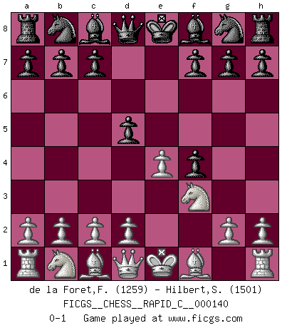 Last move : 0-1 2017 October 11 10:59:54 [Event "FICGS__CHESS__RAPID_C__000140"] [Site "FICGS"] [Date "2017.09.02"] [Round "1"] [White "de la Foret,Fred"] [Black "Hilbert,Stephan J."] [Result "0-1"] [WhiteElo "1259"] [BlackElo "1501"] 1.e4 e5 2.f4 exf4 3.Nf3 d5 0-1 This chess game has been lost on time (started : 2017.09.02 17:46:42) KGA : Abbazia defense (Classical defense, Modern defense!) Player Black won this chess game. Follow this game move after move (download)A player surprised is half beaten. (Proverb) Obwohl ich vom Stil her kaum zu den Priestern der Schachkunst gezählt werde, halte ich Schach doch für eine Kunst. (Tigran Petrosjan) La señal de un Gran Maestro es su habilidad de ganar una partida rápidamente y sin dolor. (Irving Chernev) Aucun coup ne doit être joué sans but. (Pedro Damiano) The hypothalamus is one of the most important parts of the brain, involved in many kinds of motivation, among other functions. The hypothalamus controls the 'Four Fs: Fighting, Fleeing, Feeding and Mating. (Unknown author)