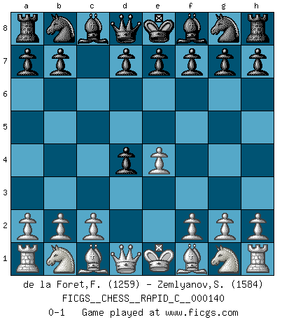 Last move : 0-1 2017 October 16 11:24:54 [Event "FICGS__CHESS__RAPID_C__000140"] [Site "FICGS"] [Date "2017.09.02"] [Round "1"] [White "de la Foret,Fred"] [Black "Zemlyanov,Sergey"] [Result "0-1"] [WhiteElo "1259"] [BlackElo "1584"] 1.e4 c5 2.d4 cxd4 0-1 This chess game has been lost on time (started : 2017.09.02 17:46:42) Sicilian : Smith-Morra gambit Player Black won this chess game. Follow this game move after move (download)Bobby is the finest Chess player this country ever produced. His memory for the moves, his brilliance in dreaming up combinations, and his fierce determination to win are uncanny. (John Collins) Schon mancher Spieler hat aufgegeben, um zu vermeiden, daß er eine Figur verliert. (Savielly Grigorievitsch Tartakower) El Ajedrez es como la guerra en un tablero. (Bobby Fischer) Mais n'est-ce pas déjà le limiter injurieusement que d'appeler les échecs un jeu? N'est-ce pas aussi une science, un art, ou quelque chose qui, comme le cercueil de Mahomet entre ciel et terre, est suspendu entre l'un et l'autre, et qui réunit un nombre incroyable de contraires ? (Stefan Zweig) I know the human being and fish can coexist peacefully. (George W. Bush, Saginaw sept. 29, 2000)