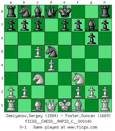 Last move : 0-1 2017 November 12 15:15:24 [Event "FICGS__CHESS__RAPID_C__000140"] [Site "FICGS"] [Date "2017.09.02"] [Round "1"] [White "Zemlyanov,Sergey"] [Black "Foster,Duncan"] [Result "0-1"] [WhiteElo "1584"] [BlackElo "1669"] 1.e4 d5 2.exd5 Nf6 3.d4 Nxd5 4.Nf3 g6 5.c4 Nb6 6.Nc3 Bg7 7.c5 Nd5 0-1 This chess game has been lost on time (started : 2017.09.02 17:46:42) Scandinavian : Marshall variation Player Black won this chess game. Follow this game move after move (download)Chess is a forcing house where the fruits of character can ripen more fully than in life. (Edward Morgan Foster) Wenn Du absolut nicht mehr weißt, was Du tun sollst, dann ist es Zeit für Panik. (John van der Wiel) Bobby solo arroja las piezas y solas caen en las casillas correctas. (Miguel Najdorf ) La vie et les Echecs sont tous les deux une lutte constante. (Lasker) A journey of a thousand sites begins with a single click. (Author unknown)