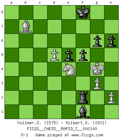 Last move : 0-1 2017 December 7 10:1:42 [Event "FICGS__CHESS__RAPID_C__000140"] [Site "FICGS"] [Date "2017.09.02"] [Round "1"] [White "Vollmer,Steve"] [Black "Hilbert,Stephan J."] [Result "0-1"] [WhiteElo "1575"] [BlackElo "1501"] 1.d4 Nf6 2.c4 e6 3.Nf3 b6 4.g3 Bb7 5.Bg2 Be7 6.Nc3 a6 7.O-O O-O 8.Bg5 h6 9.Bxf6 Bxf6 10.e4 d6 11.Qc2 Nd7 12.Rad1 Rc8 13.Rfe1 Qe8 14.b4 c5 15.bxc5 bxc5 16.d5 Qe7 17.Rb1 Rb8 18.Rb3 Ba8 19.Reb1 Rxb3 20.Rxb3 Rd8 21.Na4 g6 22.Nb6 Nxb6 23.Rxb6 Qa7 24.Rb3 Kg7 25.Qb1 Qd7 26.Rb6 Qa4 27.Qb3 Qxb3 28.Rxb3 exd5 29.exd5 Rd7 30.Rb8 Bb7 31.Nd2 Rc7 32.Ne4 Be7 33.Nxc5 Bc8 34.Nb3 Rxc4 35.Bf1 Rc3 36.Kg2 Bf5 37.Bxa6 Rc2 38.Bb7 Bf6 39.Re8 Be5 40.Kf3 Rxa2 41.Nc5 Ra5 42.Na6 Ra3+ 43.Kg2 Be4+ 44.Kh3 Rc3 45.Re7 Rc2 46.Nc7 Rxf2 47.Ne8+ Kf8 48.Rxe5 Bg2+ 49.Kg4 dxe5 50.Nd6 Bf1 51.Ne4 f5+ 0-1 Queen's Indian : Anti-Queen's Indian system Kingside Castling by player White (move 7) Kingside Castling by player Black (move 7) Player Black won this chess game. Follow this game move after move (download)A thorough understanding of the typical mating continuations makes the most complicated sacrificial combinations leading up to them not only not difficult, but almost a matter of course. (Siegbert Tarrasch) Unter Putin wird alles Geld aus Russland wie von einem Staubsauger nach Moskau umgeleitet, das ist wie ein schwarzes Loch. (Garry Kasparov) De eso se trata el Ajedrez. Un día le das una lección a tu oponente y al día siguiente el te da una a tí. (Bobby Fischer) Lorsque vous vous retrouvez devant une position atroce, ne tendez pas un ultime piège dérisoire avec l'intention d'abandonner si l'adversaire le déjoue ! Faites-vous plutôt un devoir de résister comme si votre vie en dépendait. Jouez le coup qui vous déplairait au centuple si vous étiez dans la peau de votre tortionnaire ! If you work for a living, why do you kill yourself working ? (Tuco to a chicken in The Good, The Bad and The Ugly)