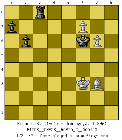 Last move : 1/2-1/2 2018 January 17 19:2:59 [Event "FICGS__CHESS__RAPID_C__000140"] [Site "FICGS"] [Date "2017.09.02"] [Round "1"] [White "Hilbert,Stephan J."] [Black "Domingo,Jordi"] [Result "1/2-1/2"] [WhiteElo "1501"] [BlackElo "1896"] 1.e4 e5 2.Nf3 Nc6 3.Bc4 f5 4.d4 exd4 5.Nxd4 Nxd4 6.Qxd4 fxe4 7.Bxg8 Rxg8 8.Qd5 Rh8 9.Qh5+ g6 10.Qe5+ Kf7 11.Nc3 Bg7 12.Qd5+ Kf8 13.O-O d6 14.f3 e3 15.Bxe3 c6 16.Qb3 d5 17.Rad1 b6 18.Rfe1 Be6 19.Ne4 h6 20.Bf4 Qd7 21.Nd6 Rd8 22.Re2 Bf7 23.Rde1 Bd4+ 24.Kf1 Bf6 25.Qe3 d4 26.Qd3 Kg7 27.Ne4 Qf5 28.Bc7 Rd7 29.g4 Qb5 30.Qxb5 cxb5 31.Bg3 Rc8 32.Nxf6 Kxf6 33.Be5+ Ke7 34.Bxd4 Kf8 35.Be3 Bc4 36.Bxh6+ Kf7 37.Kf2 Bxe2 38.Rxe2 b4 39.Bd2 Rxc2 40.Bxb4 Rxe2+ 41.Kxe2 g5 42.Be1 Re7+ 43.Kd2 Ke6 44.h4 gxh4 45.Bxh4 Rh7 46.Bf2 Kd5 47.Ke3 Rh1 48.Bg3 Rb1 49.b3 Ra1 50.f4 Rxa2 51.f5 Rb2 52.g5 Rxb3+ 53.Kf4 Rb4+ 54.Kf3 Rc4 55.g6 Rc8 56.f6 Ke6 57.f7 Kf6 1/2-1/2 Rousseau gambit Kingside Castling by player White (move 13) 10 pieces endgame at move 45 : White KBPPPP , Black KRPP WHITE : King + 1 Bishop 4 Pawns BLACK : King + 1 Rook 2 Pawns 9 pieces endgame at move 50 : White KBPPP , Black KRPP WHITE : King + 1 Bishop 3 Pawns BLACK : King + 1 Rook 2 Pawns 8 pieces endgame at move 52 : White KBPP , Black KRPP WHITE : King + 1 Bishop 2 Pawns BLACK : King + 1 Rook 2 Pawns This chess game ended in a draw. Follow this game move after move (download)Chess, like love, like music, has the power to make people happy. (Siegbert Tarrasch) Wenn ich Weiß habe gewinne ich weil ich Weiß habe, wenn ich Schwarz habe gewinne ich weil ich Bogoljubov bin. (Efim Bogoljubov) Si el ingenio solamente fuese necesario para lucirse, las mujeres serían las mejores jugadoras de Ajedrez del mundo. (Albin) Les échecs, c'est l'imagination. (David Bronstein) The existence of forgetting has never been proved: We only know that some things don't come to mind when we want them. (Friedrich Nietzsche)