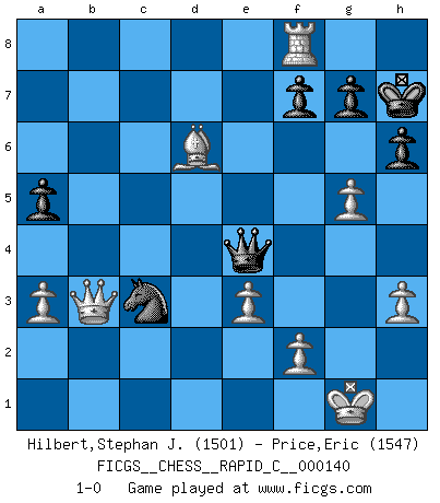 Last move : 1-0 2017 December 13 20:34:9 [Event "FICGS__CHESS__RAPID_C__000140"] [Site "FICGS"] [Date "2017.09.02"] [Round "1"] [White "Hilbert,Stephan J."] [Black "Price,Eric"] [Result "1-0"] [WhiteElo "1501"] [BlackElo "1547"] 1.b4 e5 2.Bb2 d6 3.e3 Nf6 4.c4 Be7 5.Qc2 O-O 6.Nc3 c6 7.Nf3 Bg4 8.Be2 Nbd7 9.O-O Re8 10.b5 Qc7 11.Rab1 Bf8 12.h3 Bh5 13.d3 d5 14.bxc6 bxc6 15.cxd5 cxd5 16.g4 Bg6 17.g5 e4 18.Nh4 exd3 19.Bxd3 Bxd3 20.Qxd3 Ne5 21.Nxd5 Nxd5 22.Qxd5 Rad8 23.Qg2 Nd3 24.Bd4 Qc4 25.Nf3 a5 26.Rfd1 Nb4 27.a3 Na2 28.Ne5 Qc2 29.Qf3 Rxe5 30.Bxe5 Rxd1+ 31.Qxd1 Qe4 32.Bd6 h6 33.Rb8 Nc3 34.Rxf8+ Kh7 35.Qb3 1-0 Polish (Sokolsky) opening Kingside Castling by player Black (move 5) Kingside Castling by player White (move 9) Player White won this chess game. Follow this game move after move (download)There are two classes of men; those who are content to yield to circumstances and who play whist; those who aim to control circumstances, and who play Chess. (Mortimer Collins) Fischer machte Schach einfach zu einer aufregenden Sache, wann immer er sich ans Brett setzte. (Raymond Keene) Vive, pierde y aprende al observar a tu oponente como gana. (Amber Steenbock) Ce n'est pas pour s'amuser qu'il joue aux échecs : il célèbre un culte. (Vladimir Nabokov) The Movers & Shakers of this world are those who play chess in the mornings and go to the disco in the evenings. (Dinesh De Silva)