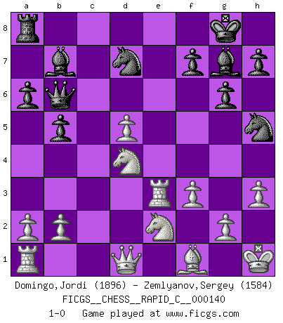 Last move : 1-0 2017 November 10 14:16:6 [Event "FICGS__CHESS__RAPID_C__000140"] [Site "FICGS"] [Date "2017.09.02"] [Round "1"] [White "Domingo,Jordi"] [Black "Zemlyanov,Sergey"] [Result "1-0"] [WhiteElo "1896"] [BlackElo "1584"] 1.e4 c5 2.Nf3 d6 3.c3 Nf6 4.Be2 g6 5.O-O Bg7 6.Bb5+ Nbd7 7.Re1 a6 8.Bf1 O-O 9.d4 e5 10.h3 cxd4 11.cxd4 exd4 12.Nxd4 Re8 13.Nc3 b5 14.Be3 Bb7 15.f3 d5 16.exd5 Rxe3 17.Rxe3 Qb6 18.Kh1 Nh5 19.Nce2 1-0 This chess game has been lost on time (started : 2017.09.02 17:46:42) Sicilian Kingside Castling by player White (move 5) Kingside Castling by player Black (move 8) Player White won this chess game. Follow this game move after move (download)As one by one I mowed them down, my superiority soon became apparent. (Jose Capablanca) Bis jetzt ist Weiß einer wohlbekannten Analyse gefolgt. Aber jetzt begeht er einen schrecklichen Fehler: Er beginnt seinen eigenen Kopf zu benutzen. (Siegbert Tarrasch) Prefiero perder una partida realmente buena, que ganar una mala. (David Levy) Votre prénom est 'Tactique', votre deuxième prénom est 'Tactique' et votre nom est 'Tactique'. (Ken Smith) I'm extremely disappointed. I send you out for exciting, new designer drugs, you come back with tomato sauce. (Gregory House, House M.D.)
