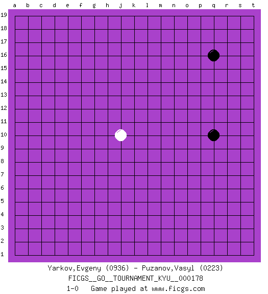 Last move : 1-0 2017 October 5 22:27:34 [Event "FICGS__GO__TOURNAMENT_KYU__000178"] [Site "FICGS"] [Date "2017.09.04"] [Round "1"] [Black "Yarkov,Evgeny"] [White "Puzanov,Vasyl"] [Result "1-0"] [Rating 1 "0936"] [Rating 2 "0223"] 1.q16 j10 2.q10 1-0 This go game has been lost on time (started : 2017.09.04 8:21:2) Here are the names of the openings (joseki) played in the four corners : Player Black won this Go (weiqi, baduk) game. Follow this game move after move (download)Learn to play under the stones. (Anonymous) Either move or be moved. (Ezra Pound)