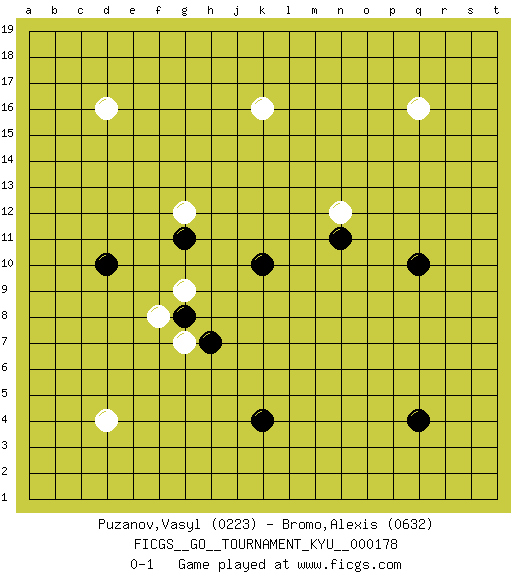 Last move : 0-1 2017 October 30 0:7:25 [Event "FICGS__GO__TOURNAMENT_KYU__000178"] [Site "FICGS"] [Date "2017.09.04"] [Round "1"] [Black "Puzanov,Vasyl"] [White "Bromo,Alexis"] [Result "0-1"] [Rating 1 "0223"] [Rating 2 "0632"] 1.k10 d4 2.k4 q16 3.q4 d16 4.d10 k16 5.q10 n12 6.n11 g12 7.g11 g7 8.h7 f8 9.g8 g9 0-1 This go game has been lost on time (started : 2017.09.04 8:21:2) Here are the names of the openings (joseki) played in the four corners : Player White won this Go (weiqi, baduk) game. Follow this game move after move (download)Balance is not what players strike for, and if it does arise, it is in spite of them. (Pierre Audouard) In God we trust, all others we virus scan. (Anonymous)