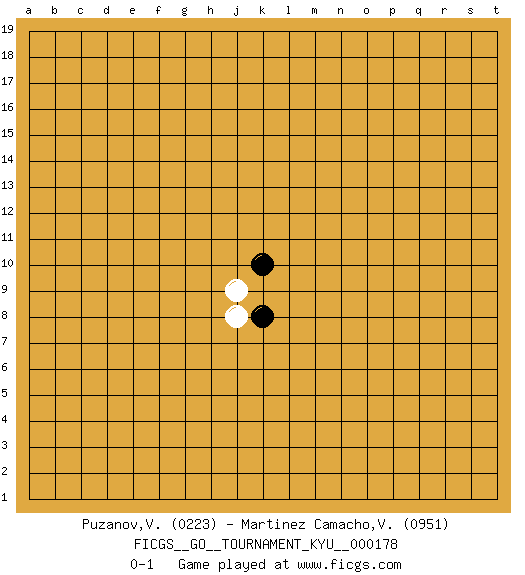 Last move : 0-1 2017 October 26 0:39:39 [Event "FICGS__GO__TOURNAMENT_KYU__000178"] [Site "FICGS"] [Date "2017.09.04"] [Round "1"] [Black "Puzanov,Vasyl"] [White "Martinez Camacho,Victor Hugo"] [Result "0-1"] [Rating 1 "0223"] [Rating 2 "0951"] 1.k10 j8 2.k8 j9 0-1 This go game has been lost on time (started : 2017.09.04 8:21:2) Here are the names of the openings (joseki) played in the four corners : Player White won this Go (weiqi, baduk) game. Follow this game move after move (download)Don't be greedy ! (Anonymous) Memory is a crazy woman that hoards colored rags and throws away food. (Austin O'Malley)