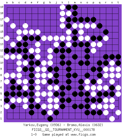 Last move : 1-0 2017 December 8 15:30:49 [Event "FICGS__GO__TOURNAMENT_KYU__000178"] [Site "FICGS"] [Date "2017.09.04"] [Round "1"] [Black "Yarkov,Evgeny"] [White "Bromo,Alexis"] [Result "1-0"] [Rating 1 "0936"] [Rating 2 "0632"] 1.q16 d4 2.q4 d16 3.q10 k16 4.k4 d10 5.k10 h12 6.j12 j13 7.k11 m12 8.k13 k14 9.k12 l13 10.l16 l15 11.m15 m16 12.l17 n15 13.m14 n14 14.m17 n16 15.n17 k17 16.h13 j14 17.g12 h11 18.g13 h14 19.g11 h10 20.h9 g10 21.n13 n12 22.o13 o14 23.m13 p13 24.o12 p12 25.o11 n11 26.n10 m10 27.l12 l14 28.m11 m9 29.m8 n9 30.o10 o9 31.p9 n8 32.n7 m7 33.l8 o7 34.n6 p8 35.q8 q7 36.l7 m6 37.m5 r8 38.q9 r9 39.l6 o6 40.o5 p5 41.q5 q6 42.p4 p6 43.f10 g9 44.g8 f9 45.e9 f8 46.e8 h8 47.j9 g7 48.e7 f7 49.e6 f6 50.e5 f5 51.e4 f4 52.f3 g3 53.e3 d3 54.h7 h6 55.j7 h4 56.j8 g8 57.g2 h2 58.j2 j3 59.h1 h3 60.k3 g5 61.l10 h5 62.q14 q13 63.p14 o16 64.o17 p16 65.p17 g14 66.f14 f15 67.e14 e15 68.d14 c14 69.c13 d15 70.b14 c15 71.b15 b16 72.a16 a17 73.a15 b13 74.b12 a14 75.d13 f11 76.e10 f13 77.e11 f12 78.r10 r14 79.r15 l18 80.s5 r6 81.b7 c7 82.c6 c8 83.d11 c10 84.s9 s8 85.s11 d6 86.d5 d7 87.b5 b8 88.e2 a7 89.b6 c11 90.c12 b11 91.a12 a11 92.d9 c9 93.s6 s7 94.r5 t9 95.t10 s10 96.t11 s9 97.r11 b4 98.a4 a3 99.a5 a8 100.b3 c4 101.c5 e12 102.d12 k5 103.m18 k18 104.l19 k19 105.m19 t6 106.t7 t8 107.l9 o4 108.n5 n4 109.o3 m4 110.l4 l5 111.j5 j4 112.k6 j6 113.k5 p3 114.m3 q3 115.r3 r2 116.s2 s3 117.q2 r4 118.p2 r3 119.o2 t5 120.n3 s4 121.o4 t2 122.o8 s1 123.p7 1-0 Here are the names of the openings (joseki) played in the four corners : Corner q16 : q16 m12 Hoshi (Hwajeom, Seongjeom, Xingwei`) 4-4 Point. The star or hoshi (4-4) point, emphasizing influence at the potential expense of territory. Corner d4 : d4 h9 Hoshi (Hwajeom, Seongjeom, Xingwei`) 4-4 Point. The star or hoshi (4-4) point, emphasizing influence at the potential expense of territory. Corner q4 : q4 m9 Hoshi (Hwajeom, Seongjeom, Xingwei`) 4-4 Point. The star or hoshi (4-4) point, emphasizing influence at the potential expense of territory. Player Black won this Go (weiqi, baduk) game. Follow this game move after move (download)Use a wall to attack, not to make territory. (Anonymous) A cynic is a man who knows the price of everything but the value of nothing. (Oscar Wilde)