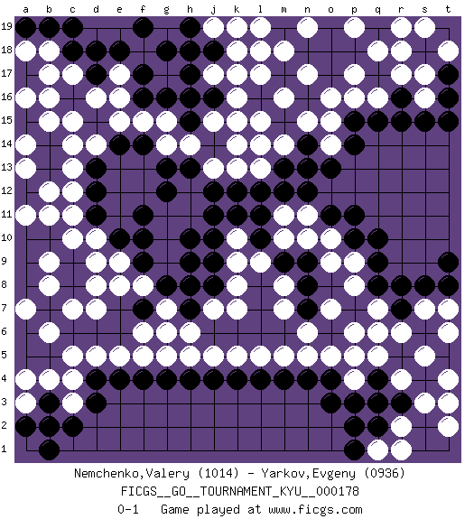 Last move : 0-1 2018 January 14 18:15:24 [Event "FICGS__GO__TOURNAMENT_KYU__000178"] [Site "FICGS"] [Date "2017.09.04"] [Round "1"] [Black "Nemchenko,Valery"] [White "Yarkov,Evgeny"] [Result "0-1"] [Rating 1 "1014"] [Rating 2 "0936"] 1.d4 d16 2.q4 q16 3.p14 d10 4.q10 o14 5.o13 n15 6.n14 o15 7.m15 m16 8.l16 m14 9.p15 l15 10.n13 k16 11.m13 l13 12.l12 p16 13.q15 k13 14.k12 o16 15.r16 d5 16.e4 e5 17.f4 f5 18.g4 g5 19.h4 h5 20.j4 j5 21.k4 k5 22.l4 l5 23.m4 m5 24.n4 n5 25.o4 k10 26.j12 j13 27.h13 h12 28.j14 h14 29.g13 j15 30.k14 l14 31.g12 h11 32.j11 g11 33.f11 g14 34.f14 f15 35.e14 d14 36.d13 c13 37.d12 c12 38.d11 c11 39.e10 e9 40.f9 g10 41.f10 g9 42.g8 f8 43.h9 g7 44.h10 h6 45.h7 j7 46.h8 k8 47.l10 l9 48.k11 m10 49.l11 m11 50.m12 n11 51.o11 o10 52.p11 p9 53.q9 p8 54.q8 q7 55.r7 r6 56.s6 s7 57.r8 s5 58.s8 t6 59.t9 p4 60.p5 p3 61.o3 o5 62.q3 q5 63.p6 q6 64.p7 r4 65.p2 o7 66.o6 n6 67.n7 p4 68.p5 p6 69.p3 p5 70.r3 s3 71.s2 t2 72.s1 r17 73.s15 s16 74.r15 c4 75.d3 c3 76.c2 b2 77.b1 a1 78.a2 a3 79.b3 b4 80.b2 a4 81.b5 c5 82.a5 b6 83.t1 t3 84.t16 s17 85.t17 t18 86.s18 r18 87.t19 r19 88.q17 q18 89.h15 g15 90.h16 l17 91.j16 k15 92.g16 e15 93.f16 j17 94.h17 e17 95.f17 h18 96.j18 k17 97.g18 k18 98.h19 s19 99.k19 l19 100.m19 j19 101.f19 h18 102.e18 g19 103.d17 e16 104.c16 c17 105.d18 c15 106.c18 e8 107.h19 b16 108.j18 r2 109.r1 q1 110.p1 b18 111.b19 a18 112.a17 a16 113.k19 l18 114.n18 j19 115.o18 t18 116.p18 p19 117.o19 p17 118.m17 m18 119.q19 h18 120.b10 c10 121.c9 d9 122.c8 b11 123.a10 a11 124.b7 d7 125.a6 a7 126.a8 b9 127.a9 b8 128.n12 g19 129.a19 b17 130.q2 r1 131.b14 c14 132.b13 b12 133.a15 a13 134.o17 n17 135.c19 n19 136.h19 p19 137.j18 k19 138.h18 c7 139.t8 t7 140.f7 g6 141.pass pass 142.pass pass 143.p10 o9 144.j9 k9 145.j8 k7 146.j10 b15 147.m9 n10 148.n9 m8 149.n8 m7 150.t15 f6 151.pass pass 152.j14 k14 153.pass a14 154.pass d8 155.s4 t4 156.pass pass 0-1 Here are the names of the openings (joseki) played in the four corners : Corner q16 : q16 p14 Hoshi (Hwajeom, Seongjeom, Xingwei`) 4-4 Point. The star or hoshi (4-4) point, emphasizing influence at the potential expense of territory. Corner d4 : d4 d5 Hoshi (Hwajeom, Seongjeom, Xingwei`) 4-4 Point. The star or hoshi (4-4) point, emphasizing influence at the potential expense of territory. Corner d16 : d16 j12 Hoshi (Hwajeom, Seongjeom, Xingwei`) 4-4 Point. The star or hoshi (4-4) point, emphasizing influence at the potential expense of territory. Player White won this Go (weiqi, baduk) game. Follow this game move after move (download)A basic: Don't push too hard. (Jansteen) Whoever said the pen is mightier than the sword obviously never encountered automatic weapons. (US General Douglas MacArthur)