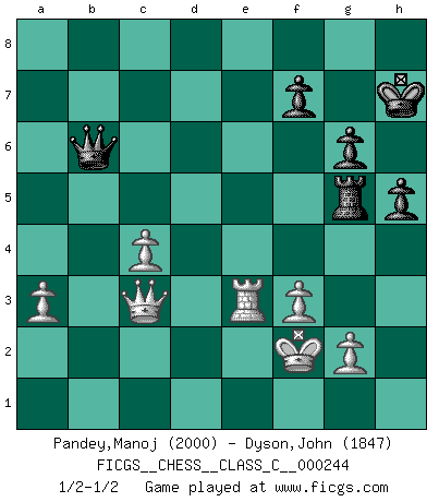 Last move : 1/2-1/2 2018 September 29 10:13:44 [Event "FICGS__CHESS__CLASS_C__000244"] [Site "FICGS"] [Date "2017.09.06"] [Round "1"] [White "Pandey,Manoj"] [Black "Dyson,John"] [Result "1/2-1/2"] [WhiteElo "2000"] [BlackElo "1847"] 1.e4 c6 2.d4 d5 3.exd5 cxd5 4.Bd3 Nc6 5.c3 Qc7 6.h3 e5 7.dxe5 Nxe5 8.Nf3 Nxd3+ 9.Qxd3 Bd6 10.Qxd5 Ne7 11.Qd1 O-O 12.Nbd2 Rd8 13.O-O Bc5 14.Qe2 Bf5 15.Ne4 Bb6 16.Nh4 Qc6 17.Nxf5 Nxf5 18.Re1 Re8 19.Qg4 Re5 20.Bf4 Rxe4 21.Qxf5 Rae8 22.Rxe4 Rxe4 23.Bg3 Re2 24.Rb1 h5 25.a3 g6 26.Qd3 Re8 27.h4 Rd8 28.Qc2 Re8 29.Qd2 Qe4 30.Rf1 a5 31.b4 Bd8 32.Qd7 Rf8 33.Rc1 Be7 34.bxa5 Rd8 35.Qc7 Bxh4 36.Bxh4 Qxh4 37.Qxb7 Qg5 38.Qb2 Rd2 39.Qb8+ Kg7 40.Qb4 Rd5 41.Rb1 Rxa5 42.c4 Rf5 43.Qb2+ Kh7 44.Re1 Qg4 45.Qc3 Qf4 46.f3 Qb8 47.Re7 Qd8 48.Re5 Qf6 49.Re3 Qb6 50.Kf1 Rg5 51.Qd2 Rf5 52.Qc3 Rg5 53.Kf2 1/2-1/2 Caro-Kann : Exchange variation Kingside Castling by player Black (move 11) Kingside Castling by player White (move 13) This chess game ended in a draw. Follow this game move after move (download)Weak points or holes in the opponent's position must be occupied by pieces not Pawns. (Siegbert Tarrasch) Bogoljubow: Matt in vier Zügen! Tartakower: Ich verbitte mir jede Belästigung! (Savielly Grigorievitsch Tartakower) Un jugador que trata de regresar una movida en el Ajedrez es un futuro carterista. (Richard Fenton) La conception d'un plan est le processus par lequel un joueur exploite les avantages de sa position tout en s'efforçant d'en réduire au minimum les inconvénients. Afin de garantir le succès, un plan doit toujours se fonder sur un diagnostic objectif des particularités d'une position. La conception d'un plan est d'autant plus difficile que la position est équilibrée, et grandement facilitée lorsqu'il n'existe qu'un seul plan susceptible de répondre aux exigences de la position. (Harry Golombek) There are 10 types of people in this world: those who understand binary and those who don't. (Anonymous)