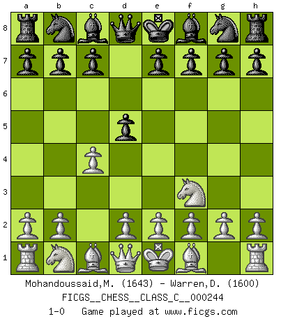 Last move : 1-0 2017 October 17 11:23:43 [Event "FICGS__CHESS__CLASS_C__000244"] [Site "FICGS"] [Date "2017.09.06"] [Round "1"] [White "Mohandoussaid,Malik"] [Black "Warren,Dylan"] [Result "1-0"] [WhiteElo "1643"] [BlackElo "1600"] 1.Nf3 d5 2.c4 1-0 This chess game has been lost on time (started : 2017.09.06 7:26:39) Reti Opening Player White won this chess game. Follow this game move after move (download)Modern Chess is too much concerned with things like Pawn structure. Forget it, Checkmate ends the game. (Nigel Short) Ein Kibitz ist einer, der deinem Gegner gute Ratschläge gibt. (Andrew Soltis) Los Peones son nacidos libres, y aún así, se encuentran encadenados por todos lados. (Rick Kennedy) Les Echecs représentent une sphère d'idées créatrices basée sur la volonté des deux protagonistes. (Smyslov) Always be a first-rate version of yourself, instead of a second-rate version of somebody else. (Judy Garland)