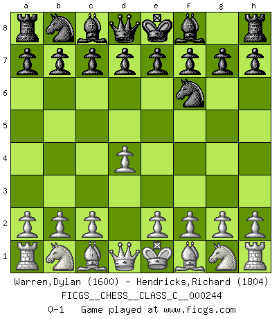 Last move : 0-1 2017 October 17 11:23:43 [Event "FICGS__CHESS__CLASS_C__000244"] [Site "FICGS"] [Date "2017.09.06"] [Round "1"] [White "Warren,Dylan"] [Black "Hendricks,Richard"] [Result "0-1"] [WhiteElo "1600"] [BlackElo "1804"] 1.d4 Nf6 0-1 This chess game has been lost on time (started : 2017.09.06 7:26:39) Queen's pawn game Player Black won this chess game. Follow this game move after move (download)Personally, I rather look forward to a computer program winning the world Chess Championship. Humanity needs a lesson in humility. (Richard Dawkings) Es gibt Leute, die glauben, alles wäre vernünftig, was man mit einem ernsthaften Gesicht tut. (Georg Christoph Lichtenberg) El Ajedrez es un regaderazo frío para la mente. (Sir John Simon) Les Cavaliers se révèlent fort utiles dans les positions fermées. D'habitude, les Fous sont un peu plus forts que les Cavaliers dans les positions ouvertes. Qu'on le veuille ou non, il restera toujours des exceptions ! The only thing that overcomes hard luck is hard work. (Harry Golden)
