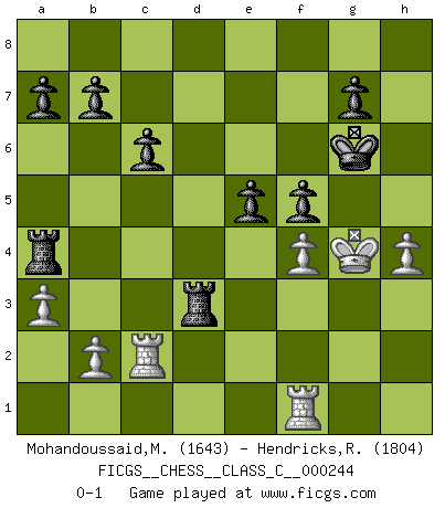 Last move : 0-1 2018 March 10 1:44:29 [Event "FICGS__CHESS__CLASS_C__000244"] [Site "FICGS"] [Date "2017.09.06"] [Round "1"] [White "Mohandoussaid,Malik"] [Black "Hendricks,Richard"] [Result "0-1"] [WhiteElo "1643"] [BlackElo "1804"] 1.c4 e5 2.Nc3 Nf6 3.d3 Nc6 4.g3 d5 5.cxd5 Nxd5 6.Bg2 Be6 7.Nf3 Be7 8.O-O O-O 9.a3 Qd7 10.Nxd5 Bxd5 11.Bd2 Rad8 12.Qc2 Bxf3 13.Bxf3 Nd4 14.Qd1 Nxf3+ 15.exf3 Qxd3 16.Bc3 f6 17.Qb3+ Qd5 18.Qxd5+ Rxd5 19.Rfe1 Kf7 20.Kf1 Rfd8 21.Ke2 Bc5 22.Rac1 c6 23.Rc2 h5 24.h3 h4 25.Ba5 Bxf2 26.Kxf2 hxg3+ 27.Kxg3 Rxa5 28.f4 Rd3+ 29.Kg4 Ra4 30.Rf1 Kg6 31.h4 f5+ 0-1 English Opening Kingside Castling by player White (move 8) Kingside Castling by player Black (move 8) Player Black won this chess game. Follow this game move after move (download)No other master has such a terrific will to win. At the board he radiates danger, and even the strongest opponents tend to freeze, like rabbits when they smell a panther. Even his weaknesses are dangerous. As white, his opening game is predictable - you can make plans against it - but so strong that your plans almost never work. In the middle game his precision and invention are fabulous, and in the end game you simply cannot beat him. (Anonymous German Expert) Sitze auf Deine Hände. (Siegbert Tarrasch) La esencia del Ajedrez es pensar acerca de lo que el Ajedrez es. (David Bronstein) Les échecs sont un jeu terrible. Si vous n'avez pas le centre, votre adversaire a une position plus libre. Par contre, si vous avez le centre, alors vous avez vraiment quelque chose pour laquelle vous inquiéter ! (Siegbert Tarrasch) The problem with manipulation is that people can turn on you. (Horatio Caine, C.S.I. Miami)