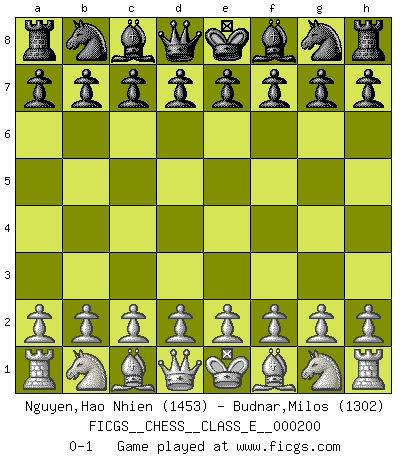 Last move : 0-1 2017 October 23 12:15:24 [Event "FICGS__CHESS__CLASS_E__000200"] [Site "FICGS"] [Date "2017.09.13"] [Round "1"] [White "Nguyen,Hao Nhien"] [Black "Budnar,Milos"] [Result "0-1"] [WhiteElo "1453"] [BlackElo "1302"] 0-1 This chess game has been lost on time (started : 2017.09.13 12:2:52) Player Black won this chess game. Follow this game move after move (download)Every Pawn is a potential Queen. (James Mason) Nur ein wirklich starker Spieler weiß wie schwach er spielt. (Savielly Grigorievitsch Tartakower) Hay dos clases de hombres: aquellos que se conforman en dejarse llevar por las circunstancias y que juegan barajas y aquellos decididos a controlar las circunstancias y que juegan al Ajedrez. (Mortimer Collins) Un journaliste : 'Vous préférez avoir une dame de plus sur l'échiquier ou au lit ?' Boris Spassky : 'Ca dépend de la position.' Somehow our devils are never quite what we expect when we meet them face to face. (Nelson DeMille)