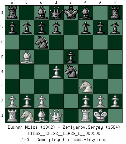 Last move : 1-0 2017 November 22 5:21:26 [Event "FICGS__CHESS__CLASS_E__000200"] [Site "FICGS"] [Date "2017.09.13"] [Round "1"] [White "Budnar,Milos"] [Black "Zemlyanov,Sergey"] [Result "1-0"] [WhiteElo "1302"] [BlackElo "1584"] 1.e4 e5 2.Nf3 Nc6 3.Bb5 Nf6 4.O-O Nxe4 5.d4 1-0 This chess game has been lost on time (started : 2017.09.13 12:2:52) Ruy Lopez : Berlin defense, Open variation Kingside Castling by player White (move 4) Player White won this chess game. Follow this game move after move (download)If your opponent cannot do anything active, then don't rush the position; instead you should let him sit there, suffer, and beg you for a draw. (Jeremy Silman) Mein Gehirn das ist mein zweitwichtigstes Organ [Aus dem Film: Der Schläfer]. (Woody Allen) Las piezas de Ajedrez son los bloques del alfabeto que moldean los pensamientos; y esos pensamientos, aunque hagan un diseño visual en el tablero, expresan abstractamente su belleza como un poema. (Marcel Duchamp) La tactique, c'est ce que vous faites quand il y a quelque chose à faire; la stratégie, c'est ce que vous faites quand il n'y a rien à faire. (Savielli Tartacower) Games, world of games... There's always an opponent, and there's always a victim. (Revolver, movie)