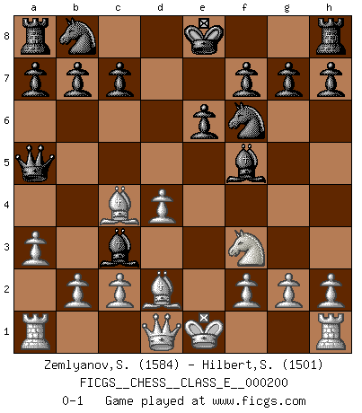 Last move : 0-1 2017 November 20 17:8:2 [Event "FICGS__CHESS__CLASS_E__000200"] [Site "FICGS"] [Date "2017.09.13"] [Round "1"] [White "Zemlyanov,Sergey"] [Black "Hilbert,Stephan J."] [Result "0-1"] [WhiteElo "1584"] [BlackElo "1501"] 1.e4 d5 2.exd5 Qxd5 3.Nc3 Qa5 4.d4 Nf6 5.Nf3 Bf5 6.Bc4 e6 7.Bd2 Bb4 8.a3 Bxc3 0-1 This chess game has been lost on time (started : 2017.09.13 12:2:52) Scandinavian defense Player Black won this chess game. Follow this game move after move (download)Tactics flow from a superior position. (Bobby Fischer) Über die Verhaftung Bobby Fischers: Warum es die Bush-Administration für nötig befindet einen 61 Jahre alten Mann zu hetzten, der für niemanden ausser sich selbste eine Gefahr darstellt ist ein Rätsel. (Nigel Short) No hay precio que no valga la pena por la cabellera del Rey enemigo. (Koblentz) Même si l'adversaire joue le coup analysé précédemment, recommencez l'analyse en voyant la nouvelle position. Première règle de Blumenfeld The beginning of wisdom is silence. The second step is listening. (Unknown)