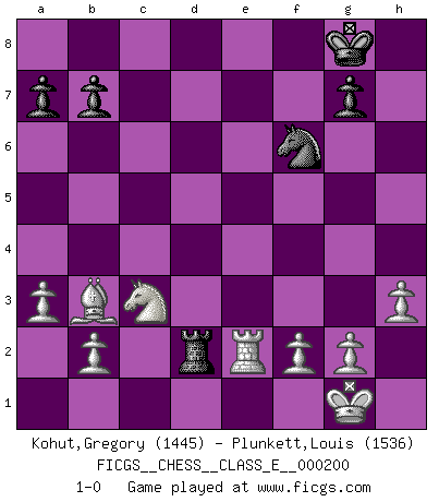 Last move : 1-0 2018 April 5 12:7:54 [Event "FICGS__CHESS__CLASS_E__000200"] [Site "FICGS"] [Date "2017.09.13"] [Round "1"] [White "Kohut,Gregory"] [Black "Plunkett,Louis"] [Result "1-0"] [WhiteElo "1445"] [BlackElo "1536"] 1.d4 d5 2.c4 Nf6 3.cxd5 Qxd5 4.Nc3 Qd8 5.e4 e6 6.Nf3 Bb4 7.Bd3 O-O 8.O-O h6 9.a3 Be7 10.Qe2 Ne8 11.e5 f5 12.exf6 Nxf6 13.Re1 Nc6 14.Be3 Ng4 15.h3 Nf6 16.Bc2 Nd5 17.Qd3 Nf6 18.Bxh6 Qe8 19.Bf4 Bd6 20.Bxd6 cxd6 21.d5 Ne5 22.Nxe5 dxe5 23.Rxe5 Qf7 24.Rae1 Re8 25.Qe3 Bd7 26.dxe6 Bxe6 27.Rxe6 Rxe6 28.Qxe6 Qxe6 29.Rxe6 Rd8 30.Bb3 Rd2 31.Re2 1-0 QGD : Marshall defense Kingside Castling by player Black (move 7) Kingside Castling by player White (move 8) Player White won this chess game. Follow this game move after move (download)I thought the most common mistake [in chess] was the first one: Learning the game :P (Garvin Gray, FICGS forum) Als er Schachweltmeister wurde ließ er praktisch alle stärksten Sovietspieler für sich arbeiten. Wenn ein auch nur mittelmässiger Meister ein Spezialist für eine bestimmte Eröffnung war, wurde er von Karpov gerufen. Das wurde alles geheim gehalten. (Mikhail Moiseyevich Botvinik) Me siento como si fuera una pieza en una partida de Ajedrez, cuando mi oponente me indica: esa pieza no puede ser movida. (Soren Kierkegaard) A chaque perte on perd un peu de soi. (Joël Lautier) They misunderestimated me. (George W. Bush, Bentonville nov. 6, 2000)