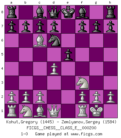 Last move : 1-0 2017 November 24 5:44:0 [Event "FICGS__CHESS__CLASS_E__000200"] [Site "FICGS"] [Date "2017.09.13"] [Round "1"] [White "Kohut,Gregory"] [Black "Zemlyanov,Sergey"] [Result "1-0"] [WhiteElo "1445"] [BlackElo "1584"] 1.e4 e5 2.Nf3 Nc6 3.Bb5 Nf6 4.O-O Nxe4 5.d4 Nd6 6.Bxc6 1-0 This chess game has been lost on time (started : 2017.09.13 12:2:52) Ruy Lopez : Berlin defense, Open variation Kingside Castling by player White (move 4) Player White won this chess game. Follow this game move after move (download)It is difficult to play against Einstein's theory --on his first loss to Fischer. (Mikhail Tal) Ich bewundere Kasparows phantasievolle Angriffssiege aus den Achtzigern und Neunzigern, aber wenn man sie mit dem Computer überprüft, nimmt der Computer in jeder zweiten Partie die Opfer an, verteidigt sich und gewinnt. (Vladimir Kramnik) Un entendimiento minucioso de las típicas continuaciones de mate hacen de las mas complicadas combinaciones de sacrificio que conducen hacia ellas no solo no dificiles, sino casi un asunto de rutina. (Siegbert Tarrasch) Soyez une menace à chaque fois que vous vous asseyez pour jouer. (Ken Smith) Cactus - It is depressed cucumber. (Ilmars Cirulis)