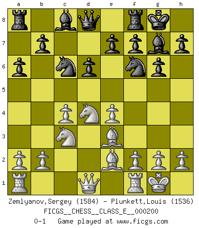 Last move : 0-1 2017 November 2 12:16:26 [Event "FICGS__CHESS__CLASS_E__000200"] [Site "FICGS"] [Date "2017.09.13"] [Round "1"] [White "Zemlyanov,Sergey"] [Black "Plunkett,Louis"] [Result "0-1"] [WhiteElo "1584"] [BlackElo "1536"] 1.e4 c5 2.Nf3 g6 3.d4 cxd4 4.Nxd4 Bg7 5.c4 Nc6 6.Be3 d6 7.Nc3 Nf6 8.Be2 O-O 9.O-O a6 0-1 This chess game has been lost on time (started : 2017.09.13 12:2:52) Sicilian : Hungarian variation Kingside Castling by player Black (move 8) Kingside Castling by player White (move 9) Player Black won this chess game. Follow this game move after move (download)Robert Fischer is a law unto himself. (Larry Evans) Man gibt nur Pakete auf. (Paul Keres) Aquellos que dicen que entienden al Ajedrez, no entienden nada. (Robert Hubner) Mon pion favori sur ma case favorite ! Bronstein en parlant d'un coup de pion en h5 quand il avait les Noirs. Perseverance does not equal worthiness. Next time you want to get my attention, wear something fun. Low-riding jeans are hot. (Gregory House, House M.D.)