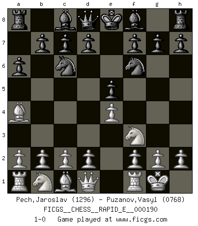 Last move : 1-0 2017 October 29 12:2:15 [Event "FICGS__CHESS__RAPID_E__000190"] [Site "FICGS"] [Date "2017.09.14"] [Round "1"] [White "Pech,Jaroslav"] [Black "Puzanov,Vasyl"] [Result "1-0"] [WhiteElo "1296"] [BlackElo "0768"] 1.e4 e5 2.Nf3 Nc6 3.Bb5 a6 4.Ba4 Nf6 5.O-O 1-0 This chess game has been lost on time (started : 2017.09.14 13:49:32) Ruy Lopez : 5.O-O Kingside Castling by player White (move 5) Player White won this chess game. Follow this game move after move (download)A thorough understanding of the typical mating continuations makes the most complicated sacrificial combinations leading up to them not only not difficult, but almost a matter of course. (Siegbert Tarrasch) Es ist besser die Steine des Gegners zu opfern. (Savielly Grigorievitsch Tartakower) Cuando tu casa esta en llamas, no puedes ser molestado por tus vecinos. O, como decinos en Ajedrez, si tu Rey esta bajo ataque, no te preocupa perder un Peón del lado de la Reina. (Gary Kasparov) Les Echecs, c'est l'art de la guerre sans les charniers, c'est la résurrection des morts tombés au champ d'honneur, l'espoir perpétuel, la suprématie de l'intelligence sur la force, la culture de l'esprit. (F. Szpiner) Industry executives and analysts often mistakenly talk about strategy as if it were some kind of chess match. But in chess, you have just two opponents, each with identical resources, and with luck playing a minimal role. The real world is much more like a poker game, with multiple players trying to make the best of whatever hand fortune has dealt them. In our industry, Bill Gates owns the table until someone proves otherwise. (David Moschella, 'Computerworld')
