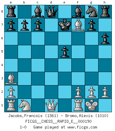 Last move : 1-0 2017 October 26 15:16:20 [Event "FICGS__CHESS__RAPID_E__000190"] [Site "FICGS"] [Date "2017.09.14"] [Round "1"] [White "Jacobs,Francois"] [Black "Bromo,Alexis"] [Result "1-0"] [WhiteElo "1361"] [BlackElo "1010"] 1.e4 e5 2.Nf3 Nc6 3.Bc4 h6 4.d4 exd4 5.c3 dxc3 6.O-O cxb2 7.Bxb2 d6 8.e5 Nxe5 9.Nxe5 dxe5 10.Bxf7+ Ke7 11.Ba3+ 1-0 King's pawn game Kingside Castling by player White (move 6) Player White won this chess game. Follow this game move after move (download)If you aren't afraid of Spassky, then I have removed the element of money. (Jim Slater) Schach verlangt totale Konzentration. (Robert James Fischer) Siempre es mejor sacrificar los hombres de tu oponente. (Savielly Tartakower) La vérité est comme le meilleur coup aux échecs : elle existe, mais il faut la chercher. (Arturo Perez-Reverte) Secret operations are essential in war; upon them the army relies to make its every move. (Sun Tzu)