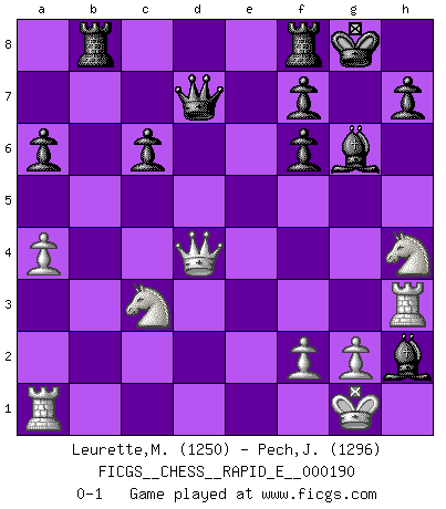 Last move : 0-1 2017 November 12 8:51:46 [Event "FICGS__CHESS__RAPID_E__000190"] [Site "FICGS"] [Date "2017.09.14"] [Round "1"] [White "Leurette,Marc-Antoine"] [Black "Pech,Jaroslav"] [Result "0-1"] [WhiteElo "1250"] [BlackElo "1296"] 1.e4 c5 2.d4 cxd4 3.c3 dxc3 4.Nxc3 Nc6 5.Bc4 a6 6.Nf3 d6 7.Bd5 e6 8.Bxc6+ bxc6 9.b3 Qc7 10.O-O Be7 11.Be3 Nf6 12.b4 O-O 13.a4 d5 14.exd5 exd5 15.Bd4 Bxb4 16.Qc2 Be6 17.Bxf6 gxf6 18.Rfd1 Bd6 19.Rd4 Qd7 20.Rh4 Bf5 21.Qd2 Bg6 22.Rh3 Rab8 23.Nh4 d4 24.Qxd4 Bxh2+ 0-1 Sicilian : Smith-Morra gambit Kingside Castling by player White (move 10) Kingside Castling by player Black (move 12) Player Black won this chess game. Follow this game move after move (download)A player surprised is half beaten. (Proverb) Herr Iljumschinow ist ein etwas merkwürdiger Geschäftsmann: Er arbeitet zusammen mit Leuten wie Muammar al-Gaddafi; früher ist das Saddam Hussein gewesen. (Joel Lautier) Dios mío, Bobby Fischer juega tan simple. (Alexei Suetin) On est toujours la mazette de quelqu'un d'autre. (Anonyme) Luck is when opportunity knocks and you answer. (Anonymous)