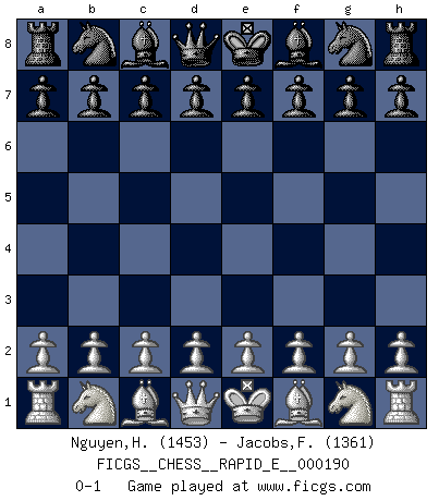 Last move : 0-1 2017 October 14 23:15:34 [Event "FICGS__CHESS__RAPID_E__000190"] [Site "FICGS"] [Date "2017.09.14"] [Round "1"] [White "Nguyen,Hao Nhien"] [Black "Jacobs,Francois"] [Result "0-1"] [WhiteElo "1453"] [BlackElo "1361"] 0-1 This chess game has been lost on time (started : 2017.09.14 13:49:32) Player Black won this chess game. Follow this game move after move (download)Strategy requires thought, tactics require observation. (Max Euwe) Die Arbeit ist etwas Unnatürliches. Die Faulheit allein ist göttlich. (Anatole France) El Ajedrez es un invernadero donde los frutos del carácter pueden madurar mas completamente que en la vida. (Edward Morgan Foster) La tactique est l'élément le plus important du milieu de jeu. (Siegbert Tarrasch) Over-the-board chess is the favorite of mortals, correspondence chess is the favorite of the gods. (Eduard Dyckhoff)