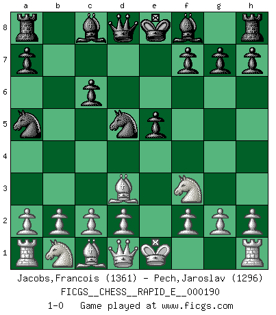 Last move : 1-0 2017 October 25 9:28:45 [Event "FICGS__CHESS__RAPID_E__000190"] [Site "FICGS"] [Date "2017.09.14"] [Round "1"] [White "Jacobs,Francois"] [Black "Pech,Jaroslav"] [Result "1-0"] [WhiteElo "1361"] [BlackElo "1296"] 1.e4 e5 2.Nf3 Nc6 3.Bc4 Nf6 4.Ng5 d5 5.exd5 Na5 6.Bb5+ c6 7.dxc6 bxc6 8.Bd3 Nd5 9.Nf3 1-0 Two knights defense Player White won this chess game. Follow this game move after move (download)He who fears an isolated Queen's Pawn should give up Chess. (Siegbert Tarrasch) Als er Schachweltmeister wurde ließ er praktisch alle stärksten Sovietspieler für sich arbeiten. Wenn ein auch nur mittelmässiger Meister ein Spezialist für eine bestimmte Eröffnung war, wurde er von Karpov gerufen. Das wurde alles geheim gehalten. (Mikhail Moiseyevich Botvinik) El hombre es un frívolo, una creatura engañosa y como un jugador de Ajedrez, se preocupa mas por el proceso de obtener su meta que de la meta por sí misma. (Dostoyevsky) Il s'avisa de me proposer d'apprendre les échecs qu'il jouait un peu... me voilà forcené des échecs. J'achète un échiquier, je m'enferme dans ma chambre, j'y passe des jours et des nuits à vouloir apprendre par cur toutes les parties. (Jean-Jacques Rousseau, Confessions) Dave, my mind is going. I can feel it. (HAL 9000 in 2001, a space odyssey)