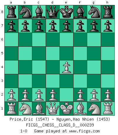 Last move : 1-0 2017 October 25 0:37:48 [Event "FICGS__CHESS__CLASS_D__000239"] [Site "FICGS"] [Date "2017.09.14"] [Round "1"] [White "Price,Eric"] [Black "Nguyen,Hao Nhien"] [Result "1-0"] [WhiteElo "1547"] [BlackElo "1453"] 1.e4 1-0 This chess game has been lost on time (started : 2017.09.14 13:55:27) King's pawn Opening Player White won this chess game. Follow this game move after move (download)Chess is above all, a fight ! (Emanuel Lasker) Ein unbeabsichtigtes Patt ist der Gipfel der Dummheit. (Anonymous) Una buena ofensiva y una buena defensa, comienzan ambas con un buen desarrollo. (Bruce A. Moon) Les sacrifices démontrent seulement que quelqu'un a gaffé. (Savielly Tartacover) It's unlucky to be superstitious. (Dave Enteles)