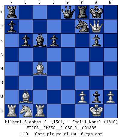 Last move : 1-0 2017 October 2 21:36:28 [Event "FICGS__CHESS__CLASS_D__000239"] [Site "FICGS"] [Date "2017.09.14"] [Round "1"] [White "Hilbert,Stephan J."] [Black "Zmolil,Karel"] [Result "1-0"] [WhiteElo "1501"] [BlackElo "1800"] 1.b4 g6 2.Bb2 f6 3.e4 e5 4.a3 c5 5.Bc4 cxb4 6.axb4 Bxb4 7.Nf3 Nh6 8.O-O Nc6 9.d4 d6 10.c3 Ba5 11.d5 Ne7 12.Qa4+ Bd7 13.Qxa5 Qc8 14.Bd3 O-O 15.c4 f5 16.c5 b6 17.Qd2 Nf7 18.c6 Nxc6 19.Rc1 Qe8 20.dxc6 Bxc6 21.exf5 e4 22.fxg6 hxg6 23.Bc4 exf3 24.Qh6 fxg2 25.Qg7+ 1-0 Polish (Sokolsky) opening Kingside Castling by player White (move 8) Kingside Castling by player Black (move 14) Player White won this chess game. Follow this game move after move (download)The older I grow, the more I value Pawns. (Keres) Die meiste Zeit treffe ich auf Gegner, die meine Enkel sein könnten. Ich bin da, um ihnen zu zeigen, dass sie von mir noch einiges lernen können. (Viktor Kortschnoi) Un mal plan es mejor que no tener ningún plan. (Frank Marshall) A ce moment-là, je menaçais de comprendre la position ! (Clément L'Heureux) A government big enough to give you everything you want is strong enough to take everything you have. (Thomas Jefferson)