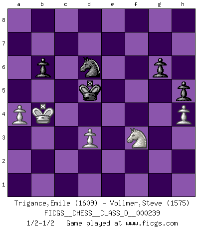 Last move : 1/2-1/2 2017 October 7 17:48:27 [Event "FICGS__CHESS__CLASS_D__000239"] [Site "FICGS"] [Date "2017.09.14"] [Round "1"] [White "Trigance,Emile"] [Black "Vollmer,Steve"] [Result "1/2-1/2"] [WhiteElo "1609"] [BlackElo "1575"] 1.f4 d5 2.Nf3 Nf6 3.e3 g6 4.b3 Bg7 5.Bb2 O-O 6.Be2 Nc6 7.d3 Ng4 8.Bxg7 Nxe3 9.Qc1 Nxg2+ 10.Kf2 Kxg7 11.Kxg2 d4 12.Nbd2 e5 13.Ne4 f5 14.Ng3 Re8 15.Re1 e4 16.dxe4 fxe4 17.Ng5 e3 18.Qd1 h6 19.Nh3 Qh4 20.Ng1 Qxf4 21.Rf1 Qd6 22.Bg4 Bxg4 23.Qxg4 Qd5+ 24.Nf3 Rad8 25.Kg1 h5 26.Qg5 Qxg5 27.Nxg5 Re7 28.a3 Rd5 29.h4 Rc5 30.Rac1 e2 31.Nxe2 Rxe2 32.Rf7+ Kg8 33.Rxc7 d3 34.Rf1 Rf5 35.cxd3 Rxf1+ 36.Kxf1 Re7 37.Rxe7 Nxe7 38.Ke2 Nf5 39.Nf3 Kf7 40.Kd2 Ke6 41.Kc2 Kd5 42.Kc3 a5 43.a4 b6 44.b4 axb4+ 45.Kxb4 Nd6 1/2-1/2 Bird's Opening Kingside Castling by player Black (move 5) 10 pieces endgame at move 45 : White KNPPP , Black KNPPP WHITE : King + 1 Knight 3 Pawns BLACK : King + 1 Knight 3 Pawns This chess game ended in a draw. Follow this game move after move (download)I give 98 percent of my mental energy to Chess. Others give only 2 percent. (Bobby Fischer) Alles was am Schachbrett zählt sind gute Züge. (Robert James Fischer) Tu no necesitas jugar muy bien, únicamente ayudar a tu oponenet a que juegue muy mal. (Genrikh Chepukaitis) Plusieurs personnes se sont demandées comment Tal faisait pour gagner... En fait, c'est très simple ! Il met ses pièces au centre de l'échiquier et les sacrifie quelque part ! (David Bronstein) Home computers are being called upon to perform many new functions, including the consumption of homework formerly eaten by the dog. (Doug Larson)