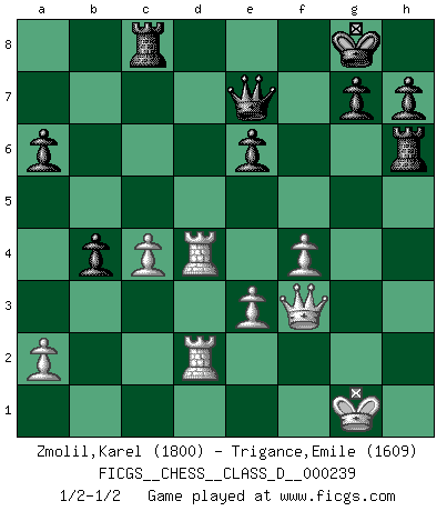 Last move : 1/2-1/2 2017 October 3 8:10:31 [Event "FICGS__CHESS__CLASS_D__000239"] [Site "FICGS"] [Date "2017.09.14"] [Round "1"] [White "Zmolil,Karel"] [Black "Trigance,Emile"] [Result "1/2-1/2"] [WhiteElo "1800"] [BlackElo "1609"] 1.d4 d5 2.Nf3 Nf6 3.Bg5 Nbd7 4.h3 e6 5.e3 Be7 6.Bd3 c5 7.c3 b6 8.b3 Bb7 9.O-O O-O 10.Qc2 Ne4 11.Bf4 f5 12.Nbd2 a6 13.Ne5 Nxe5 14.Bxe5 Nxd2 15.Qxd2 Bf6 16.Bh2 Rc8 17.Rac1 Be7 18.Qe2 b5 19.c4 dxc4 20.bxc4 b4 21.dxc5 Bxc5 22.Rfd1 Qe8 23.Be5 Qg6 24.g3 Rf7 25.Kh2 Qg5 26.f4 Qe7 27.Rd2 Bc6 28.Re1 Qb7 29.Bd4 Be7 30.g4 Bf3 31.Qf2 fxg4 32.Rf1 Bf6 33.Qg3 Be4 34.Be2 Bxd4 35.Rxd4 gxh3 36.Bf3 Bxf3 37.Qxf3 Qe7 38.Qxh3 Rf6 39.Qf3 Rh6+ 40.Kg1 Qh4 41.Rf2 Qe7 42.Rfd2 Qh4 43.Rf2 Qe7 44.Rfd2 1/2-1/2 Torre attack (Tartakower variation) Kingside Castling by player White (move 9) Kingside Castling by player Black (move 9) This chess game ended in a draw. Follow this game move after move (download)My style is somewhere between that of Tal and Petrosian. (Reshevsky) Alle Schachspieler sollten auch ein Hobby haben. (Savielly Grigorievitsch Tartakower) Cuando me preguntan: -¿Cual es el secreto que te hace hacer mejores movidas que tus oponentes?, Yo respondo: Me da gusto que me pregunten eso, porque, como veran, hay una simple razón. Yo pienso mis propias movidas y dejo a mi oponente que el piense las suyas. (Alexander Alekhine) Mon pion favori sur ma case favorite ! Bronstein en parlant d'un coup de pion en h5 quand il avait les Noirs. We're missing something. (Gregory House, House M.D.)